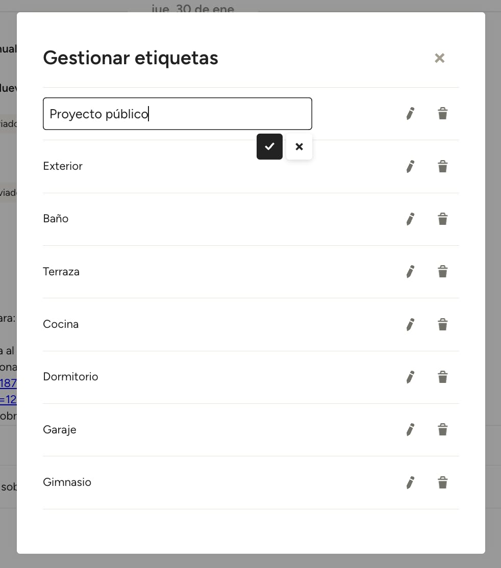 Se abrirá un cuadro en el que puedes hacer clic en el icono de edición para cambiar el nombre de una etiqueta, o bien pulsar el botón con forma de papelera para eliminarla. Si eliminas una etiqueta, desaparecerá de las solicitudes a las que se haya aplicado. Ten en cuenta que esta acción no se puede deshacer.
