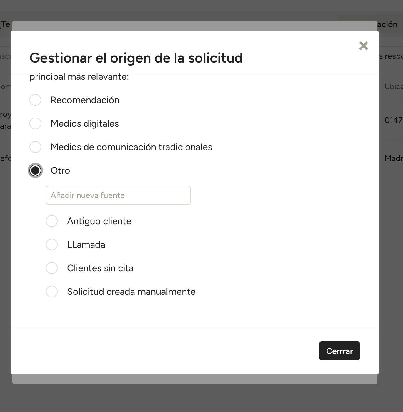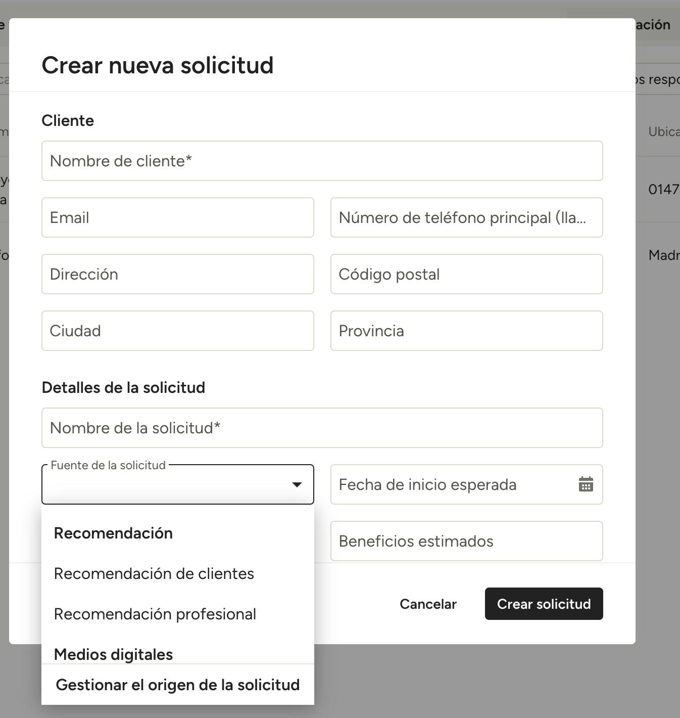A la hora de crear una nueva solicitud, puedes indicar su origen para saber de dónde proviene la mayor parte de la demanda.