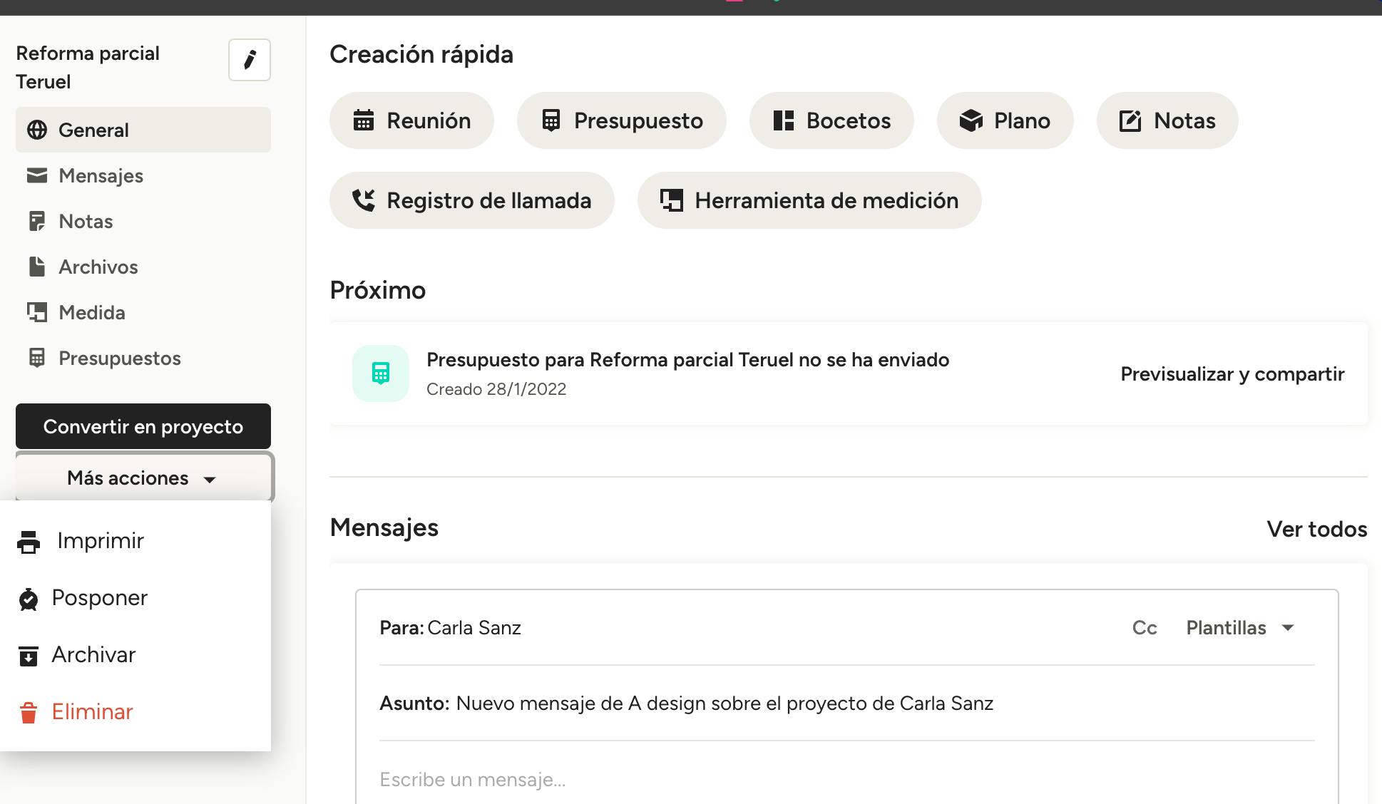 En el lado izquierdo de esta página, puedes navegar a las funciones relevantes del proyecto, incluyendo detalles del resumen del proyecto, notas, tareas, planos en 3D, calendario, archivos, herramienta de medición, contratos y presupuestos. También puedes usar el menú de Creación Rápida para agregar rápidamente una nueva tarea, reunión, contrato, presupuesto/propuesta, plano 3D y más. Puedes convertirlo en un proyecto si se gana la solicitud, y puedes Eliminar, Archivar, Imprimir o Posponer desde Más Acciones.