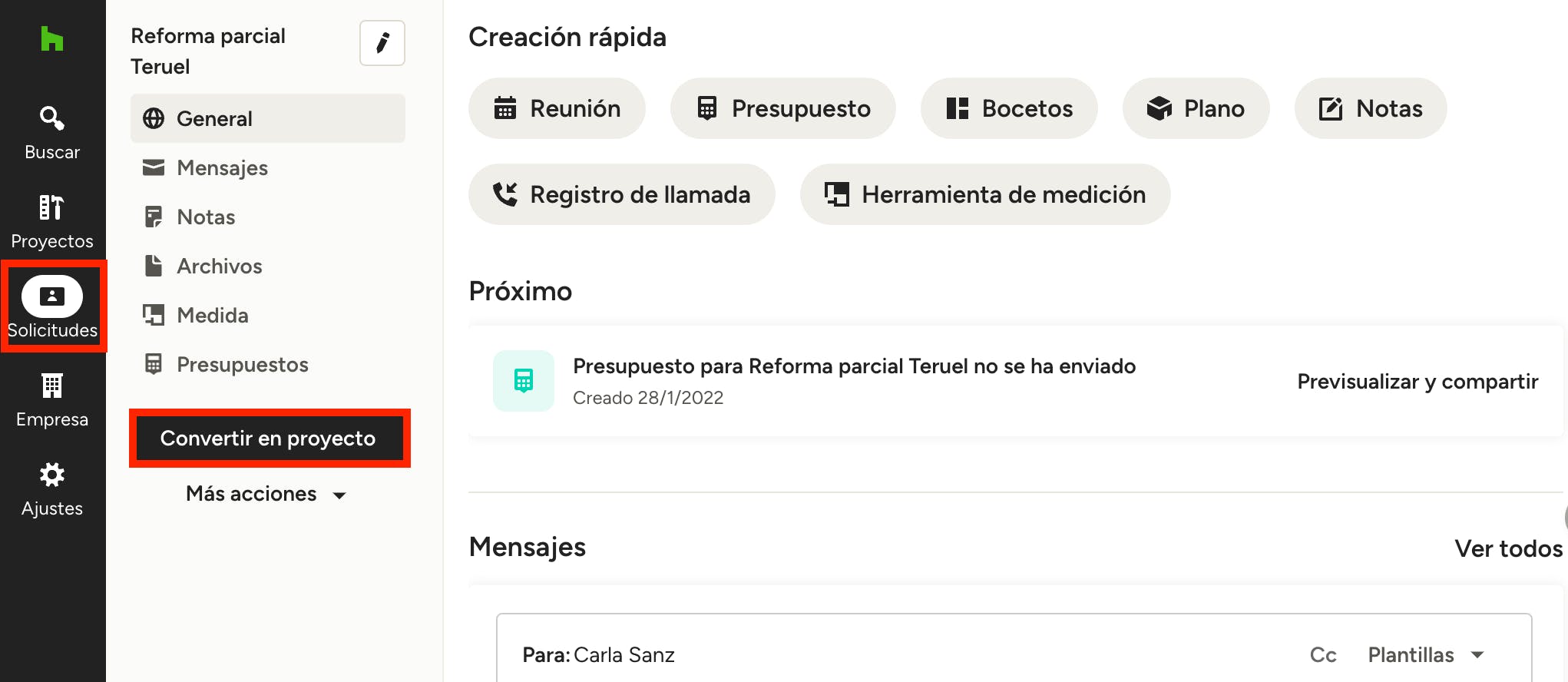 Para hacerlo, haz clic en el icono Solicitudes en el menú de navegación izquierdo y elige la solicitud adecuada. Dentro de la misma, haz clic en la opción Convertir en proyecto que se encuentra en el menú izquierdo.