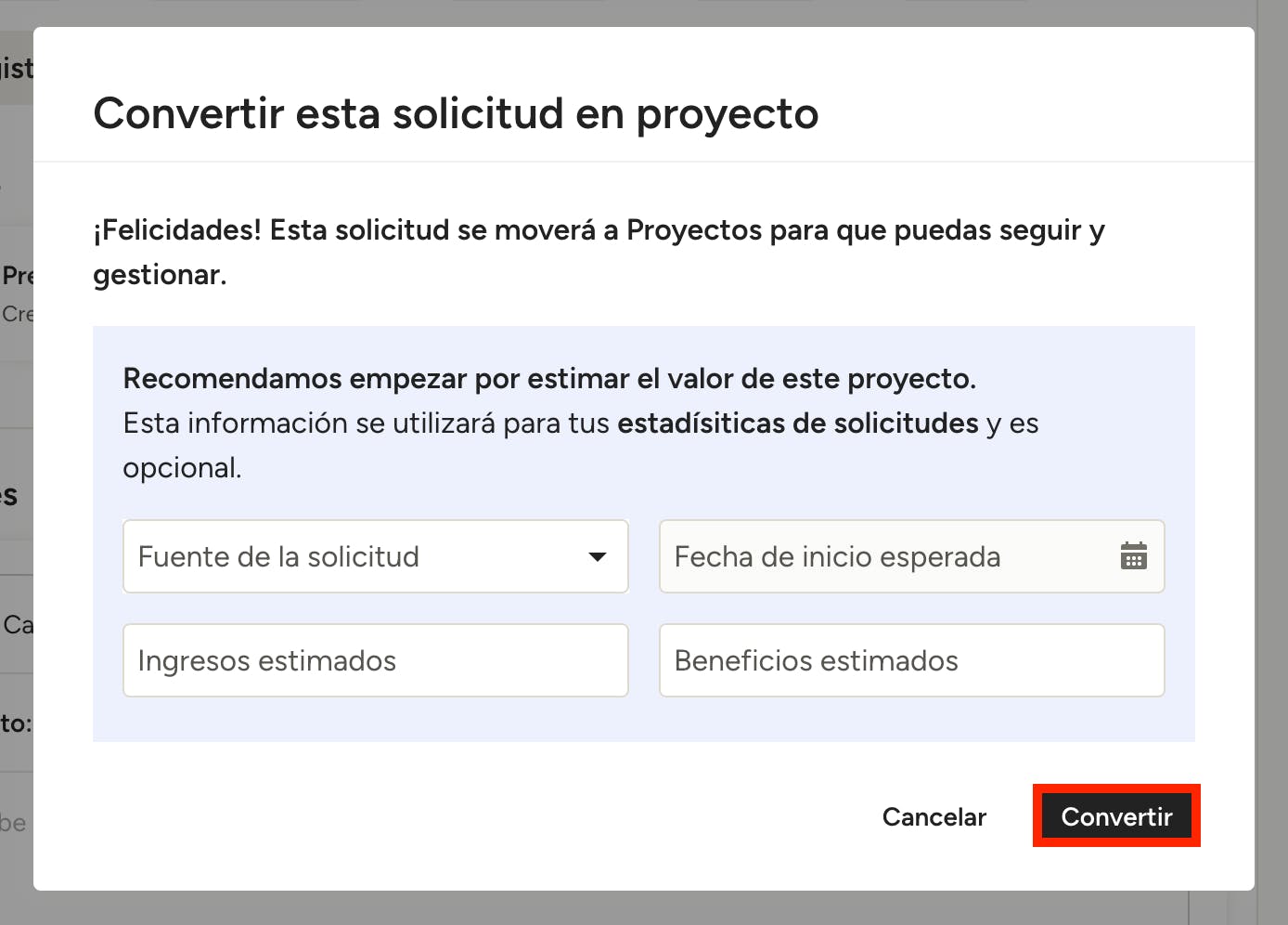 Se abrirá una ventana en la que puedes introducir los detalles del proyecto, tales como la fuente de la solicitud, la fecha de inicio esperada y los ingresos y beneficios estimados. Todos estos datos son opcionales y se usan para la información de tu solicitud, por lo que no tienes que completarlos si no lo deseas. Para terminar, pulsa Convertir.