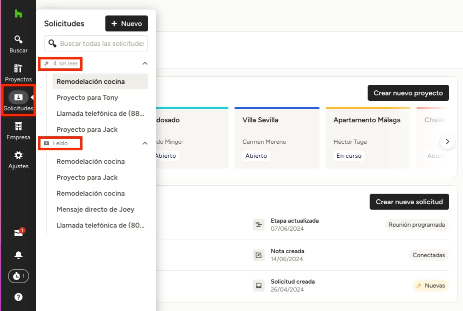 Para ver y acceder a todas tus solicitudes, pulsa el icono Solicitudes en el menú izquierdo de navegación. Si arrastras el ratón por encima, verás una lista de las solicitudes leídas y sin leer para que puedas revisarlas rápidamente y saber cuáles son nuevas.