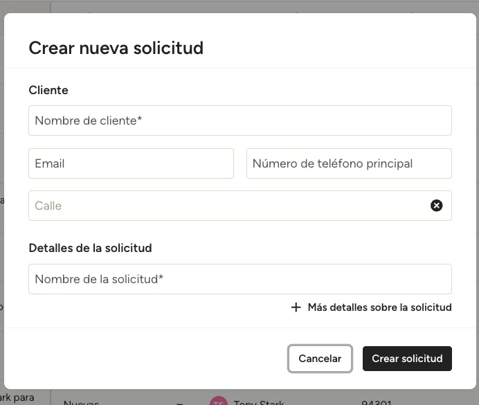 - Detalles del cliente: el nombre y los detalles del cliente vinculado a la solicitud.