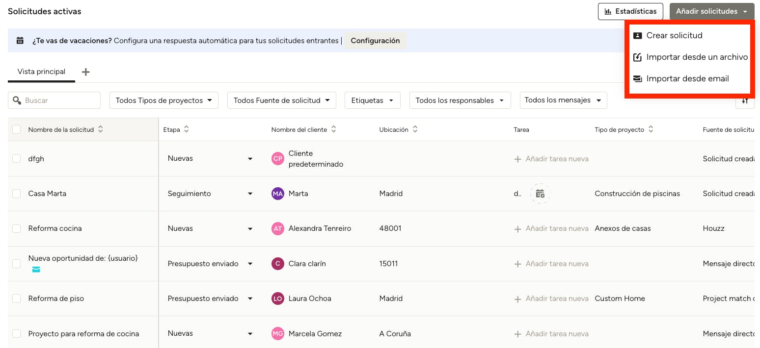 Para hacerlo, simplemente haz clic en el botón Añadir solicitudes en la parte superior derecha de tu lista de solicitudes. Puedes seleccionar Crear nueva solicitudes, Importar desde archivo o Importar desde email.