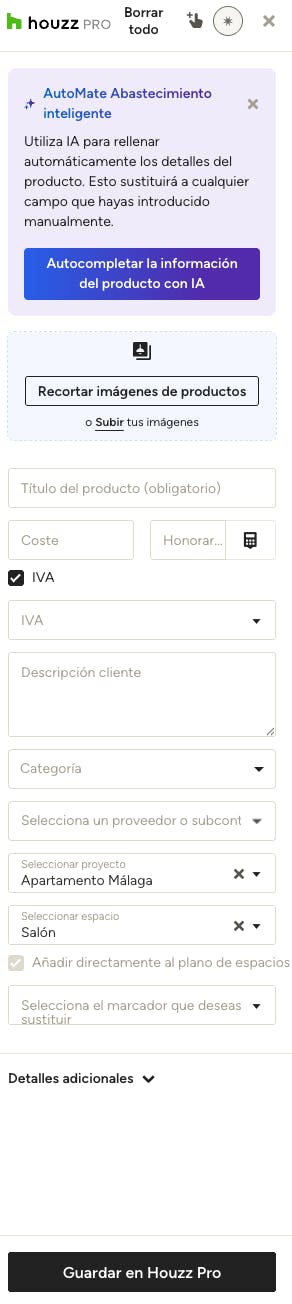 En Clipper, puedes usar AutoMate AI de Houzz Pro para completar automáticamente los detalles de un producto, evitando que tengas que introducir la información manualmente campo por campo. Esto hace que añadir productos a tu biblioteca de productos de Houzz Pro sea más rápido y preciso.