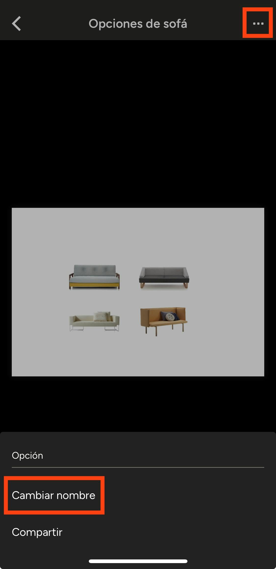 También puedes tocar el icono con forma de tres puntos y seleccionar Cambiar nombre para darle uno nuevo. Si quieres realizar otros cambios, deberás hacerlo desde la versión web para ordenador.
