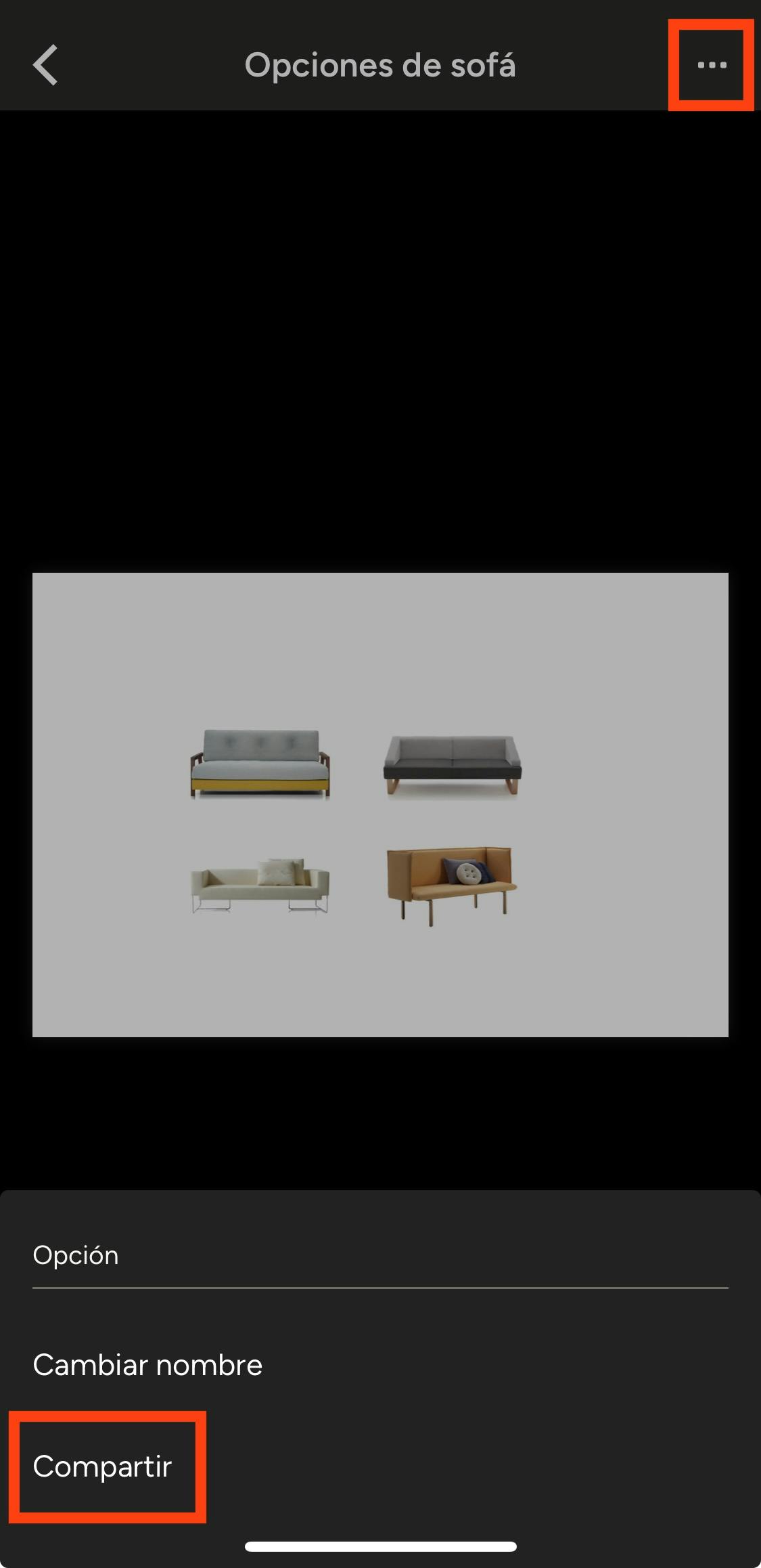 Para compartir un boceto desde la app, toca el botón con forma de tres puntos en la parte superior derecha del boceto y selecciona Compartir.