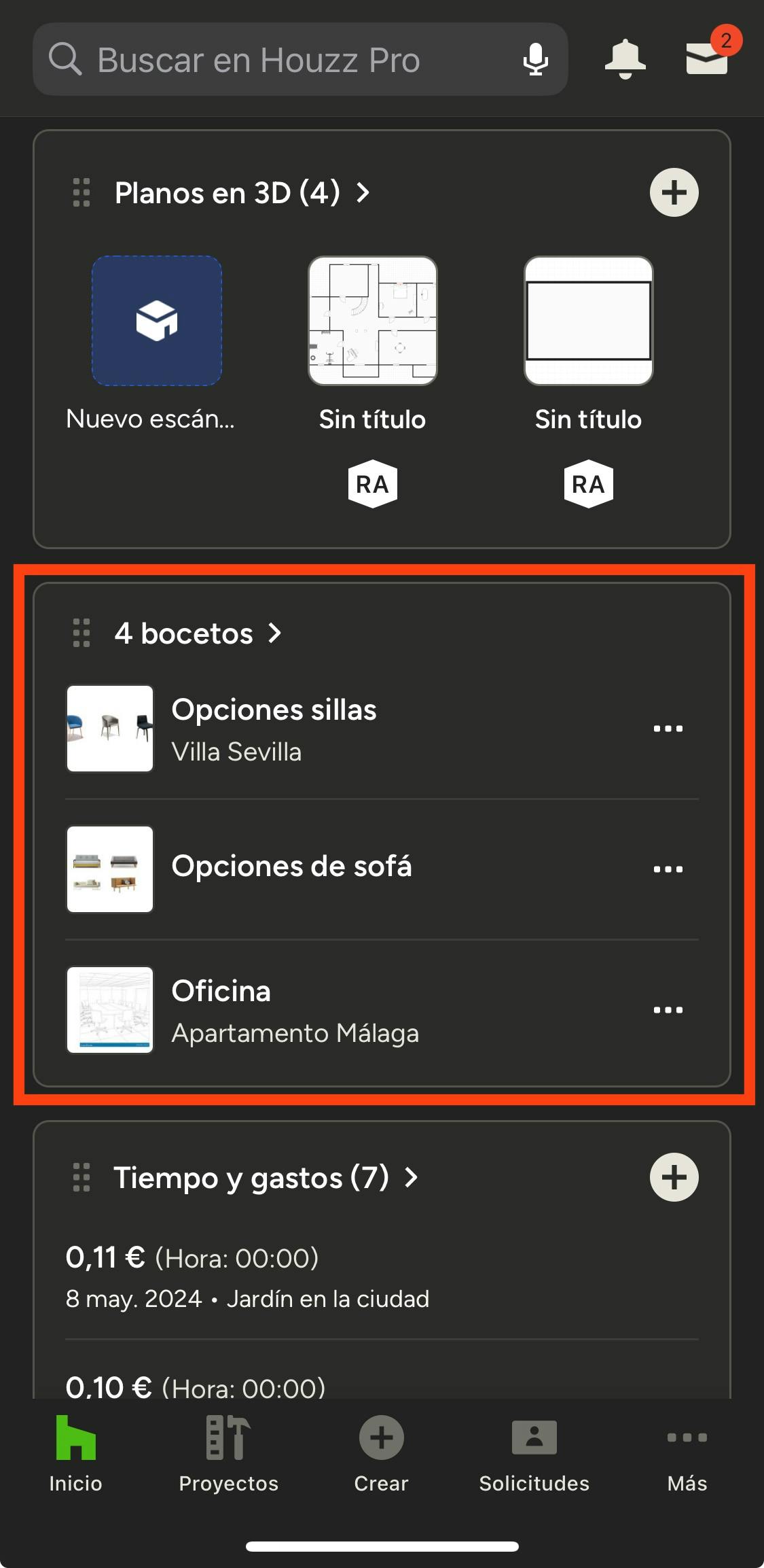 Puedes acceder a tus bocetos desde la sección Bocetos en la página principal de la app (todos los bocetos) o en la página de un proyecto (para ver aquellos específicos de ese proyecto). Deslízate hacia abajo para encontrar la sección. Desde ahí puedes tocar un boceto individual o tocar el título para ver una lista de todos ellos.