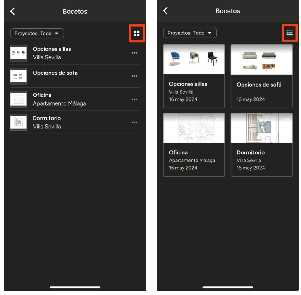 Puedes ver los bocetos en forma de lista (imagen de la izquierda) o de cuadrícula (imagen de la derecha). Toca el icono que se encuentra en la parte superior derecha para cambiar entre un modo y otro.