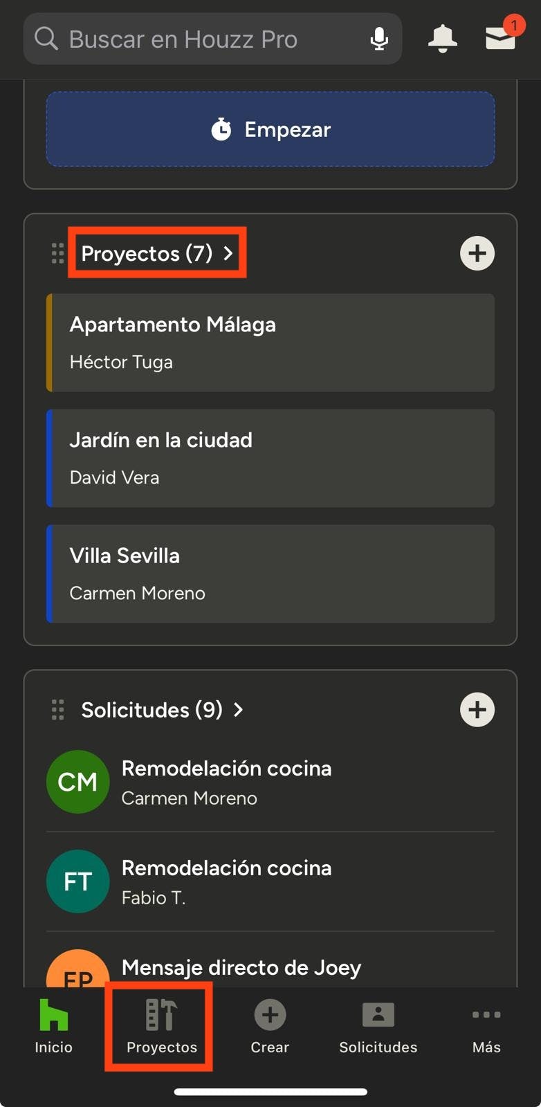 Para empezar, ve al proyecto en cuestión. Puedes seleccionarlo desde la página principal, o tocar el icono Proyectos en la parte inferior de la pantalla y elegirlo en la lista que se abrirá a continuación.