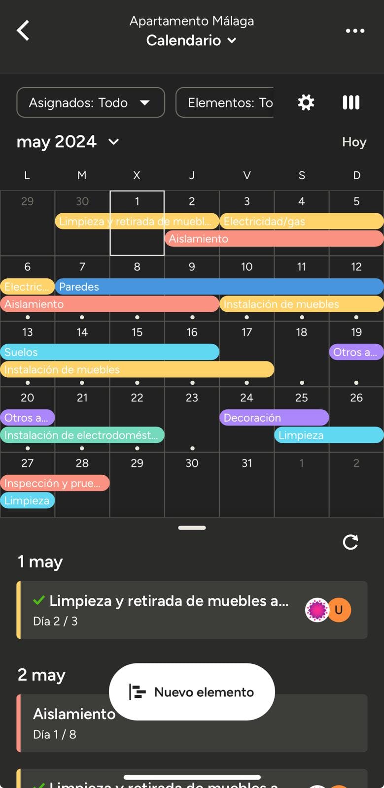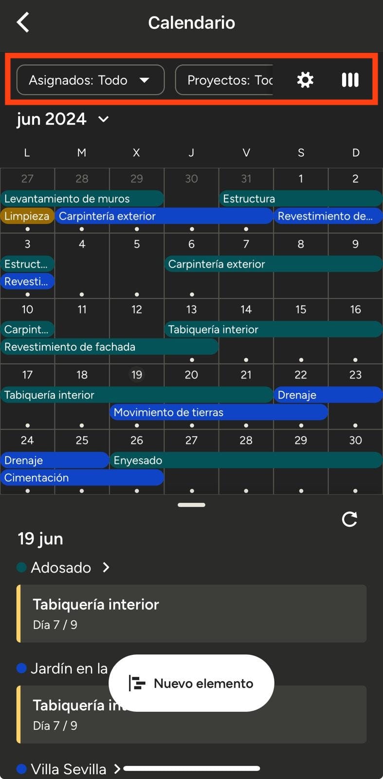 Los elementos aparecen desglosados por proyecto, por lo que puedes visualizar cuáles pertenecen a cada uno con facilidad. Además, tienes la posibilidad de filtrar por asignados, proyectos y elementos a través de las opciones que aparecen arriba.