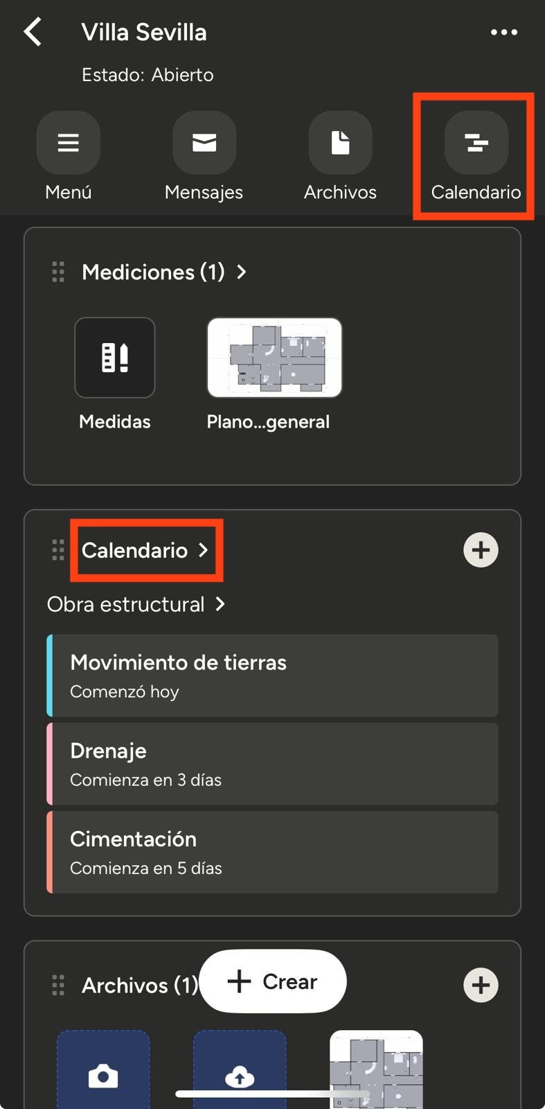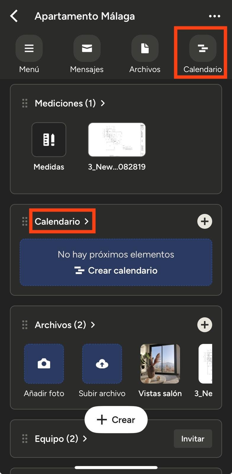 Cuando estés en la página del proyecto, accede al icono Calendario en la parte superior de la página, o toca la sección Calendario que encontrarás si te desplazas hacia abajo.