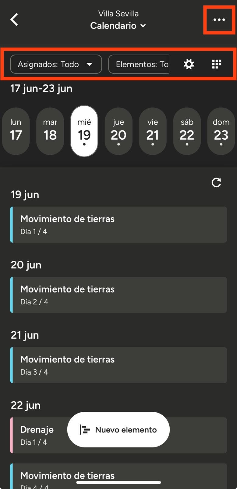 Si ya has creado un calendario para un proyecto existente, puedes ver los elementos planificados en la app.