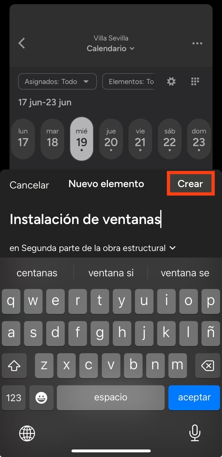 Toca el botón Nuevo elemento que aparece en el calendario. Se abrirá una ventana en la que puedes introducir el título del elemento y asignarlo a una fase a elegir en el menú desplegable. Cuando hayas acabado, selecciona Crear.
