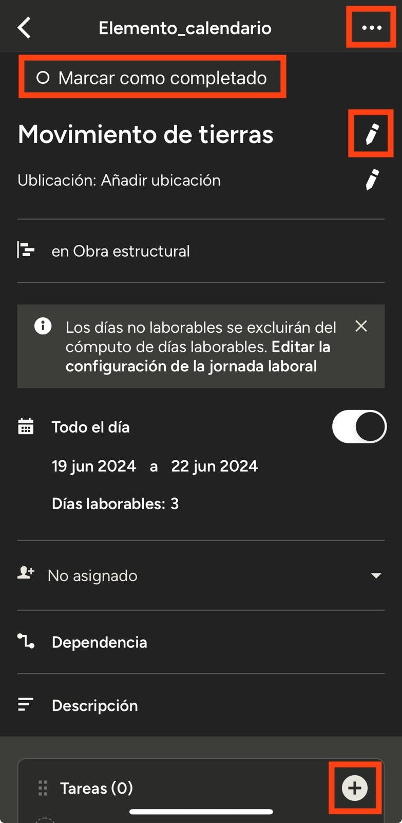 - Editar el nombre del elemento, la ubicación, la fase, la fecha y la descripción