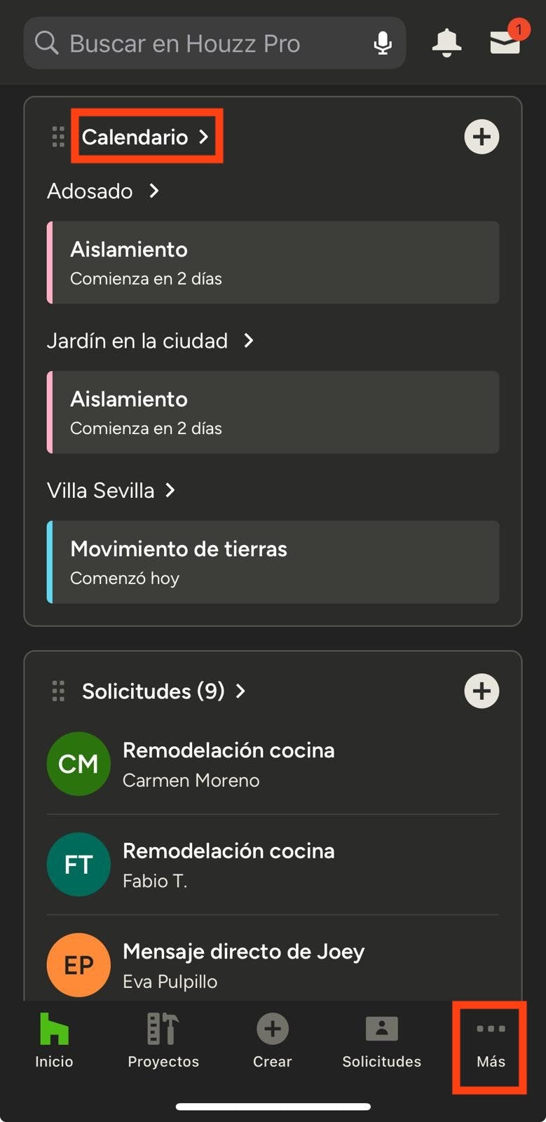 Para consultar el calendario, ve al proyecto en cuestión. Puedes seleccionarlo desde la página principal, o tocar el icono Proyectos en la parte inferior de la pantalla y elegirlo en la lista que se abrirá a continuación.