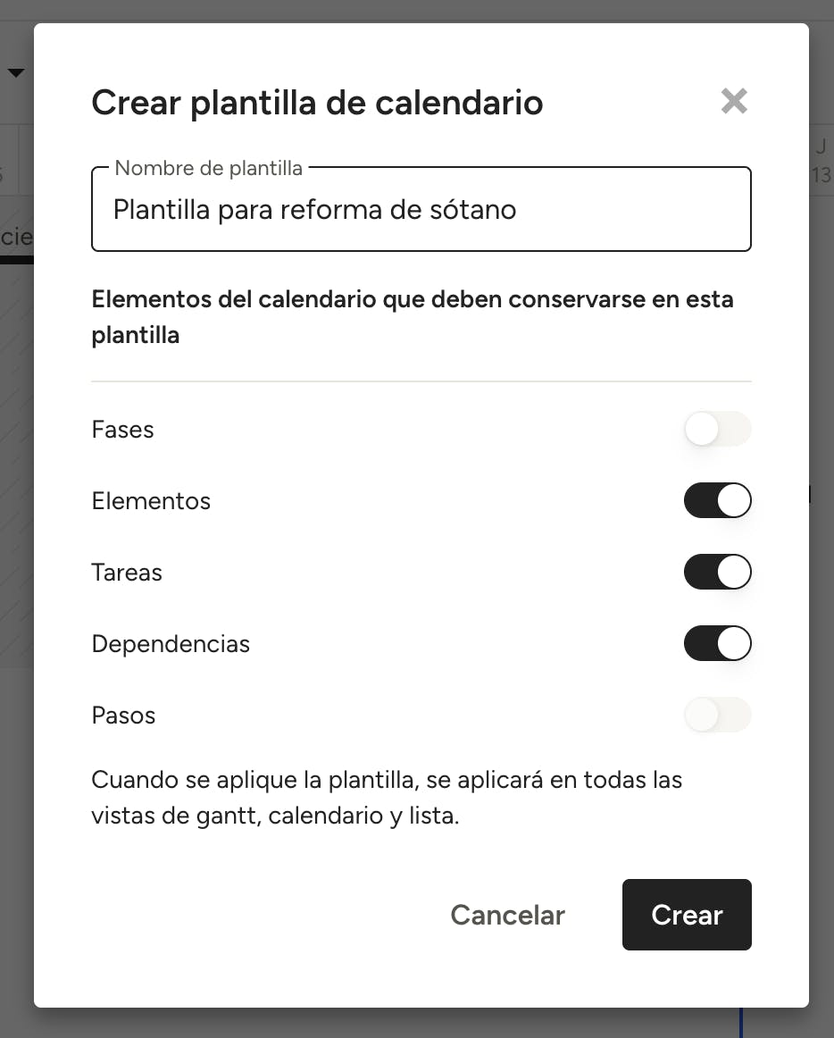 Tendrás la opción de ponerle nombre a la plantilla y elegir los aspectos del calendario que quieras aplicarle. Puedes activar o desactivar las fases, los elementos, las tareas, las dependencias y los pasos (si los desactivas no se guardarán en tu plantilla).