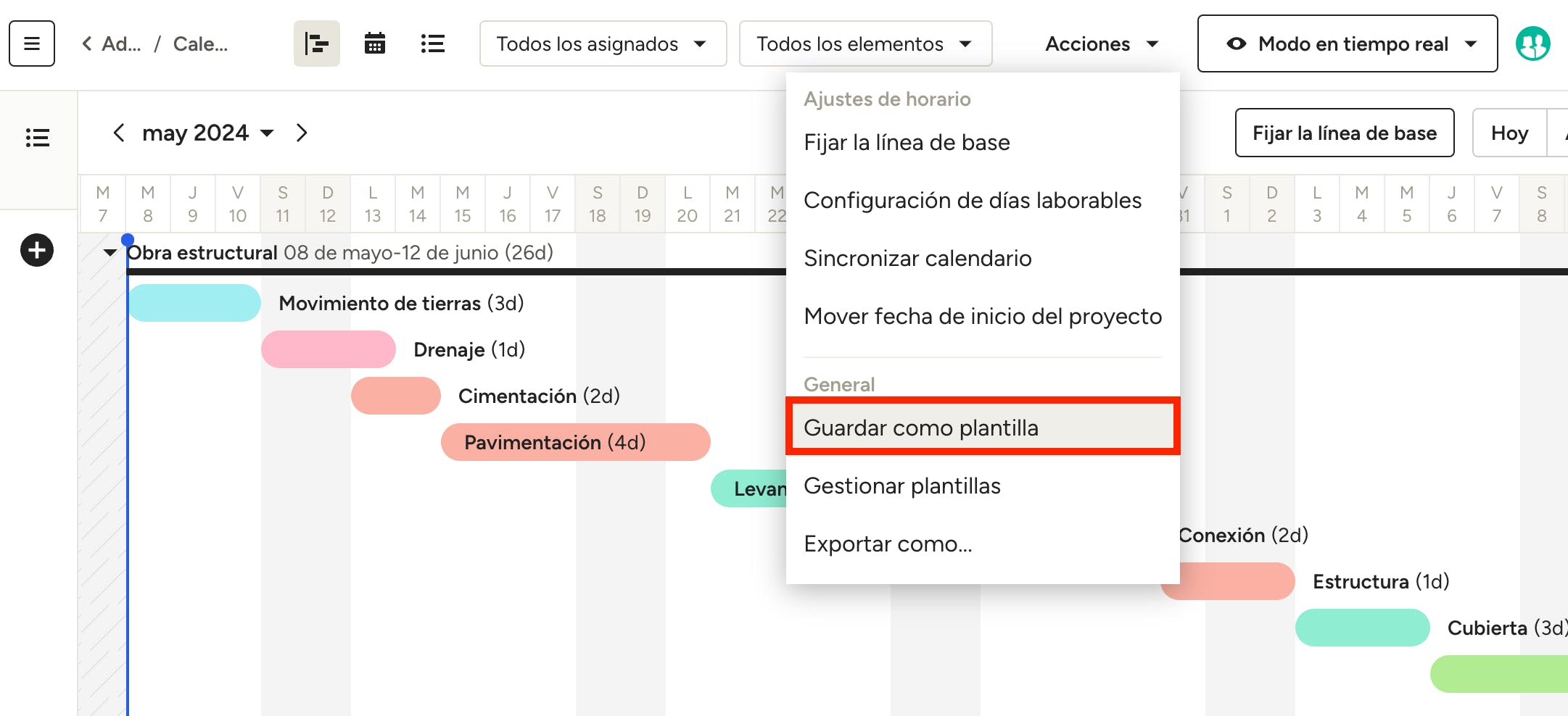 Es muy fácil: cuando hayas creado tu calendario, haz clic en el botón Acciones en la parte superior de la plantilla. En el menú desplegable elige la opción Guardar como plantilla.