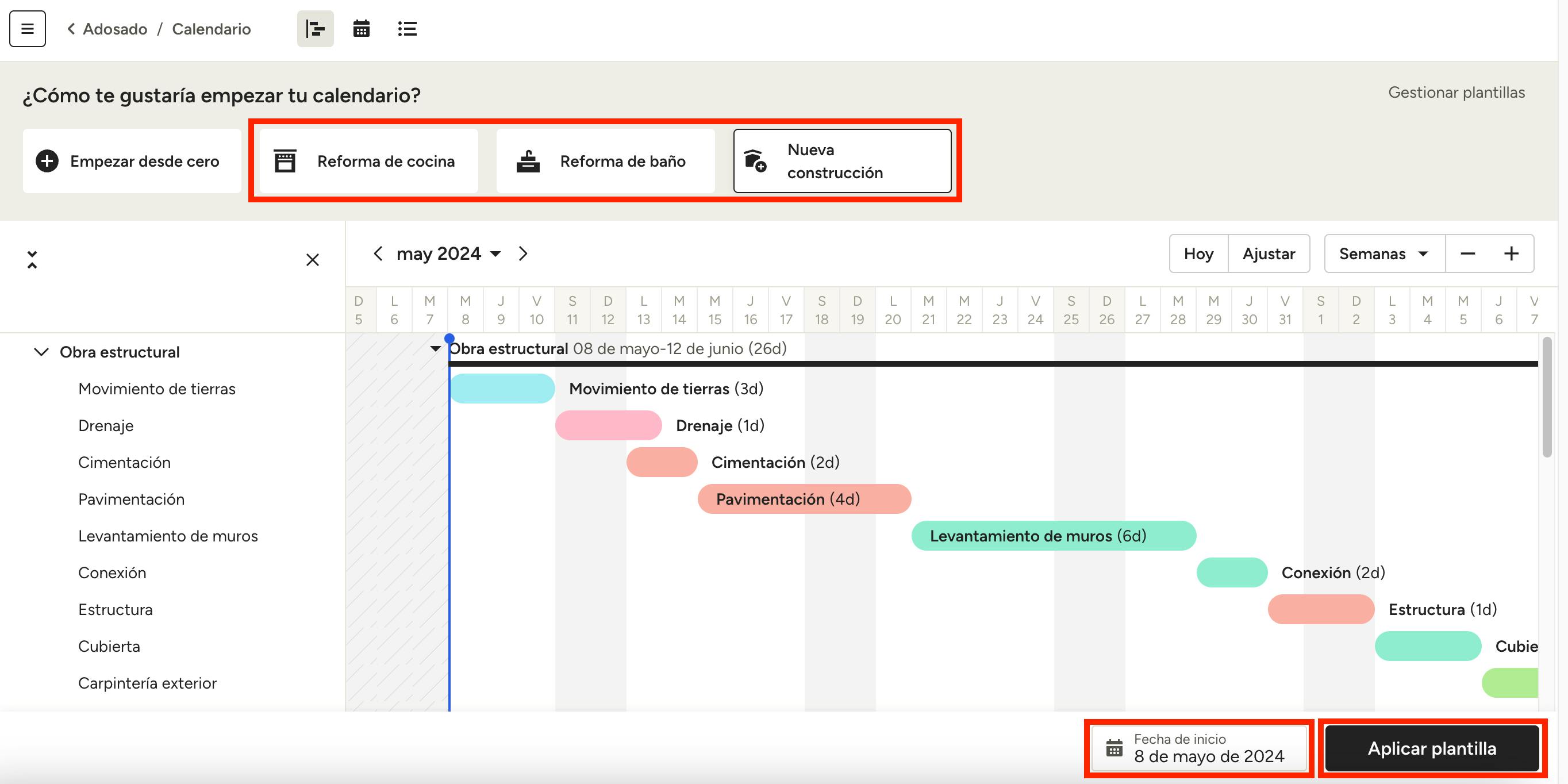 Las plantillas predefinidas aparecen en la parte superior del calendario. Primero verás las personalizadas, y después las predefinidas. Para crear el calendario, selecciona la plantilla que prefieras, indica la fecha de inicio en la parte inferior de la pantalla y haz clic en Aplicar plantilla. A continuación podrás ajustar las fases, los elementos, las tareas, las dependencias y los pasos para que se ajusten al proyecto o solicitud.