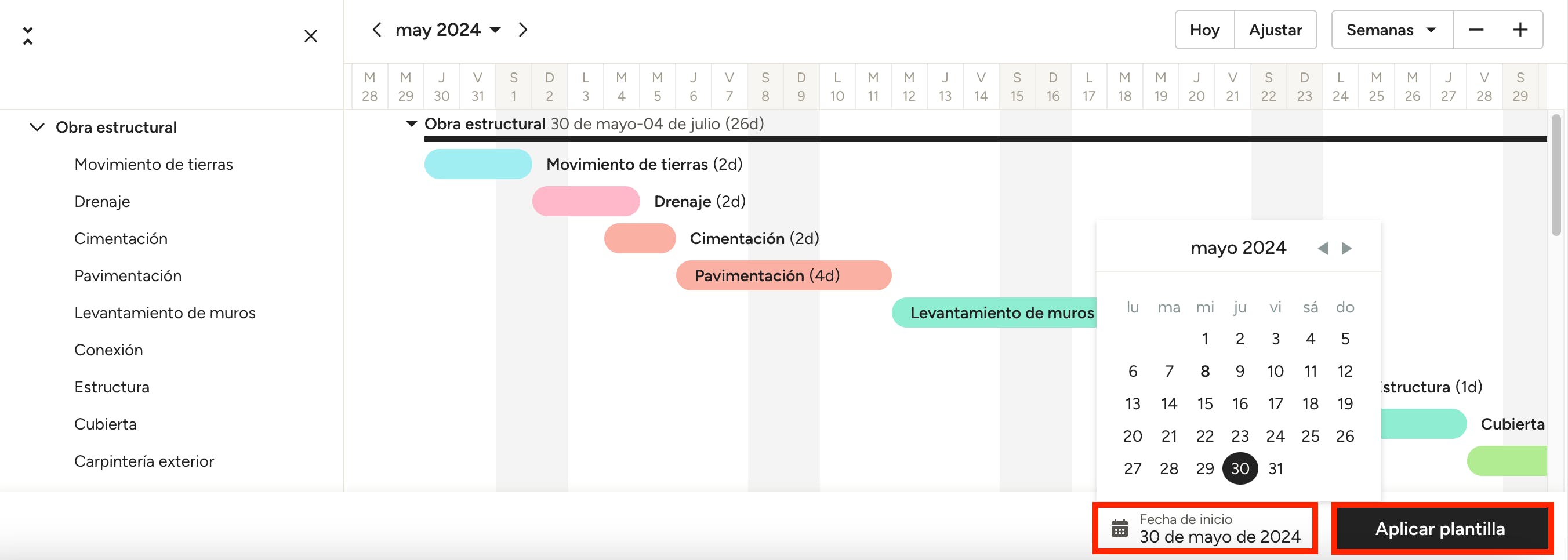Cuando selecciones la plantilla personalizada, podrás elegir la fecha de inicio del proyecto en la parte inferior de la pantalla. Añádela y haz clic en Aplicar plantilla. Todo lo que hubieras guardado en tu calendario anterior se aplicará al proyecto o solicitud nueva, y podrás ajustar las fases, los elementos, las tareas, las dependencias y los pasos.