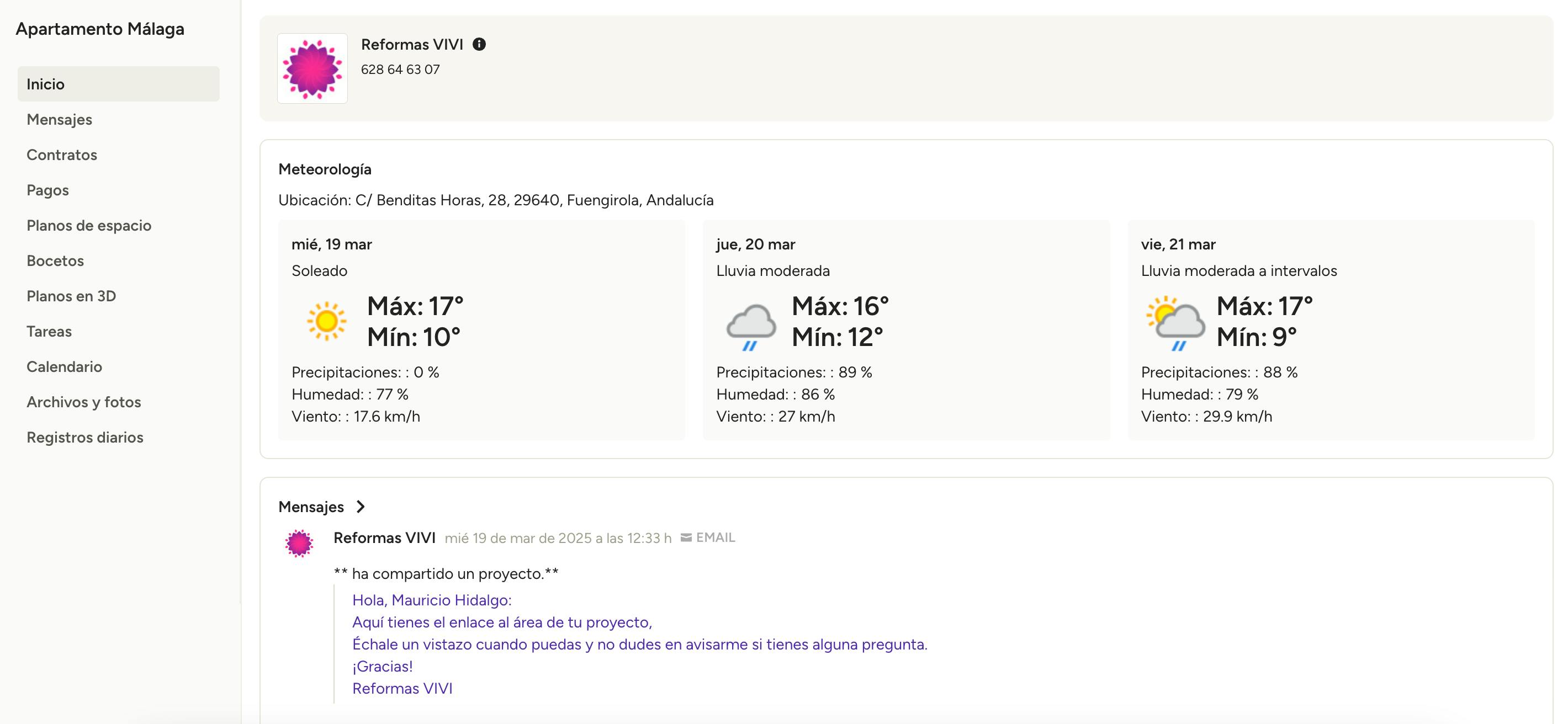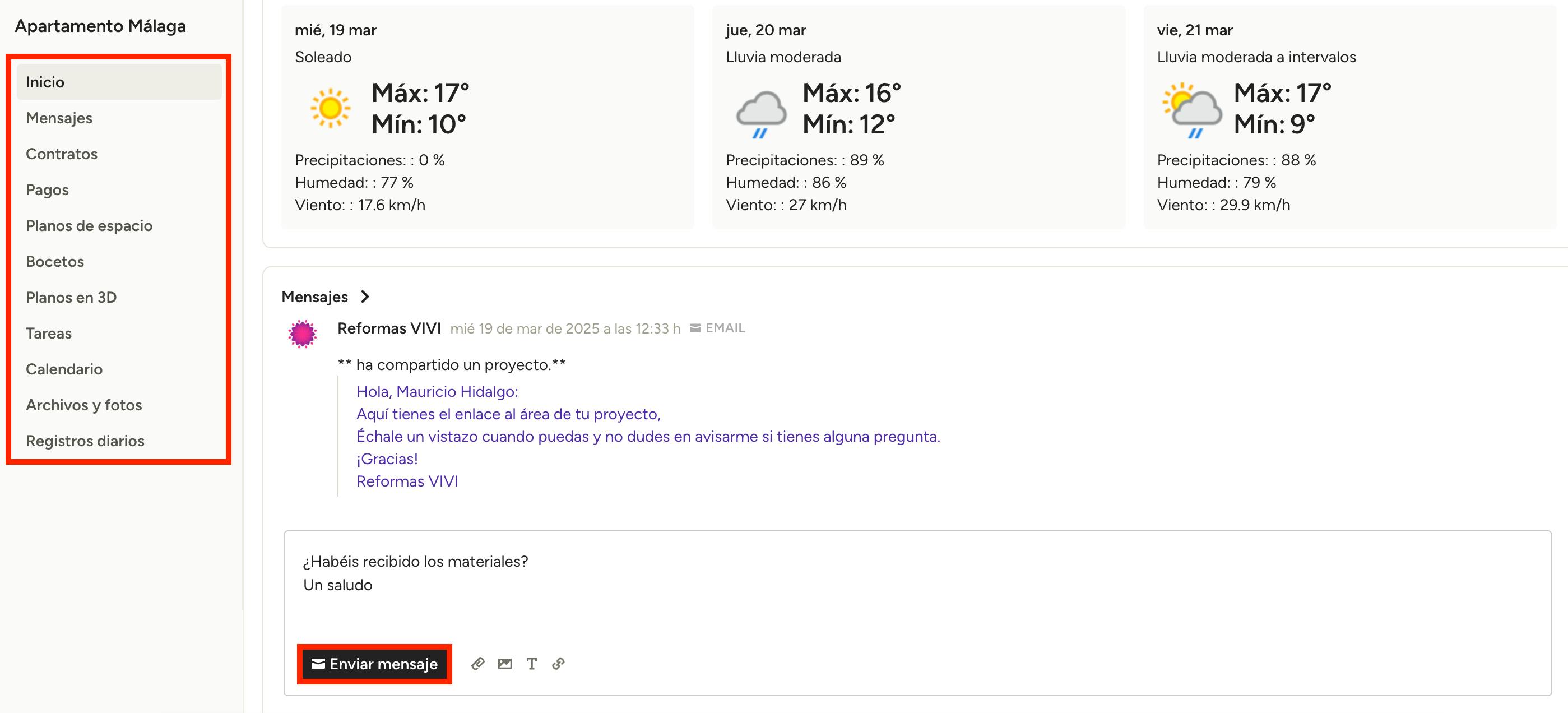 Cuando estés en el área de proyectos, verás un resumen general del estado general del proyecto, incluidos los documentos, mensajes o información financiera relevante (si el profesional ha compartido estos detalles contigo). Puedes enviarle un mensaje rápidamente a través del botón Enviar mensaje.
