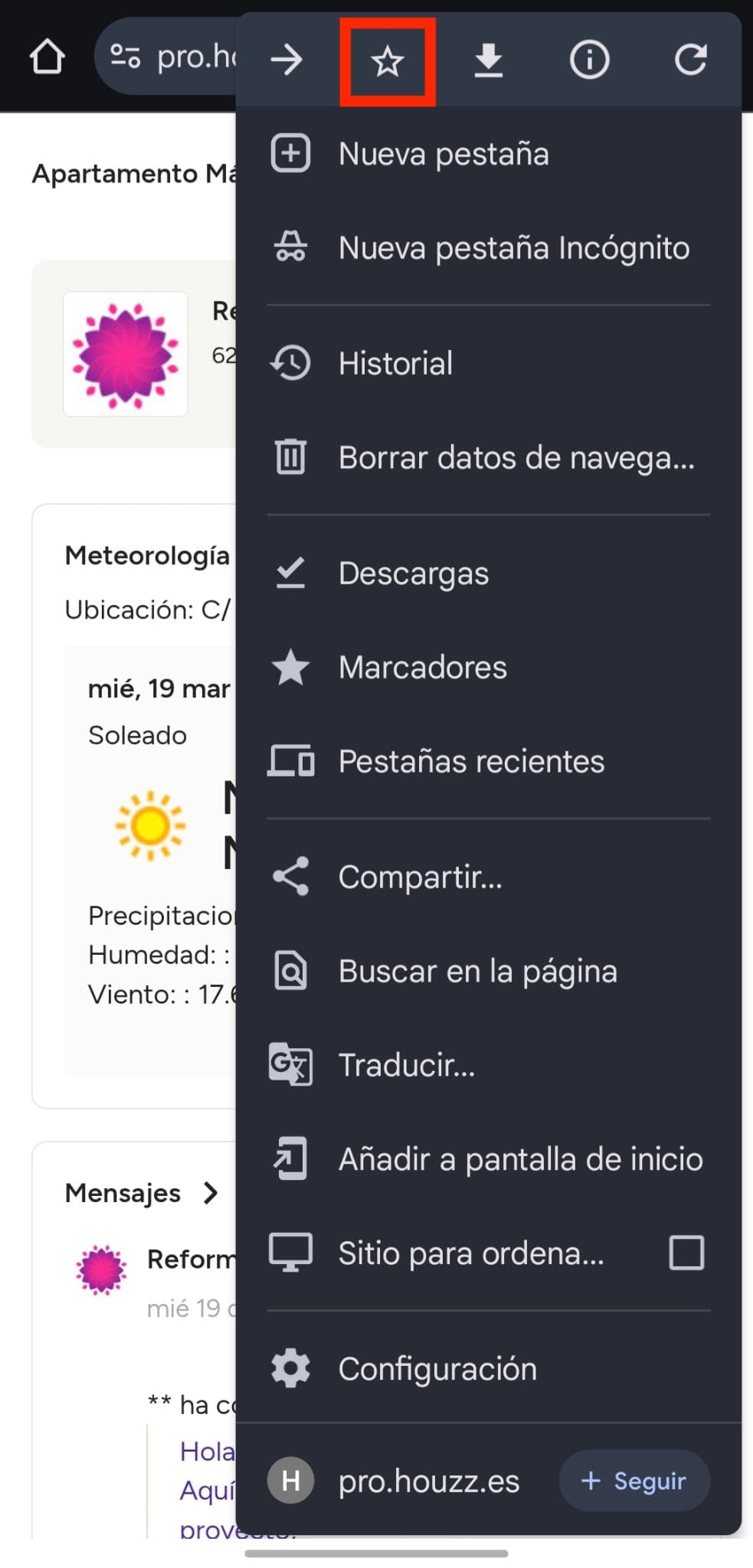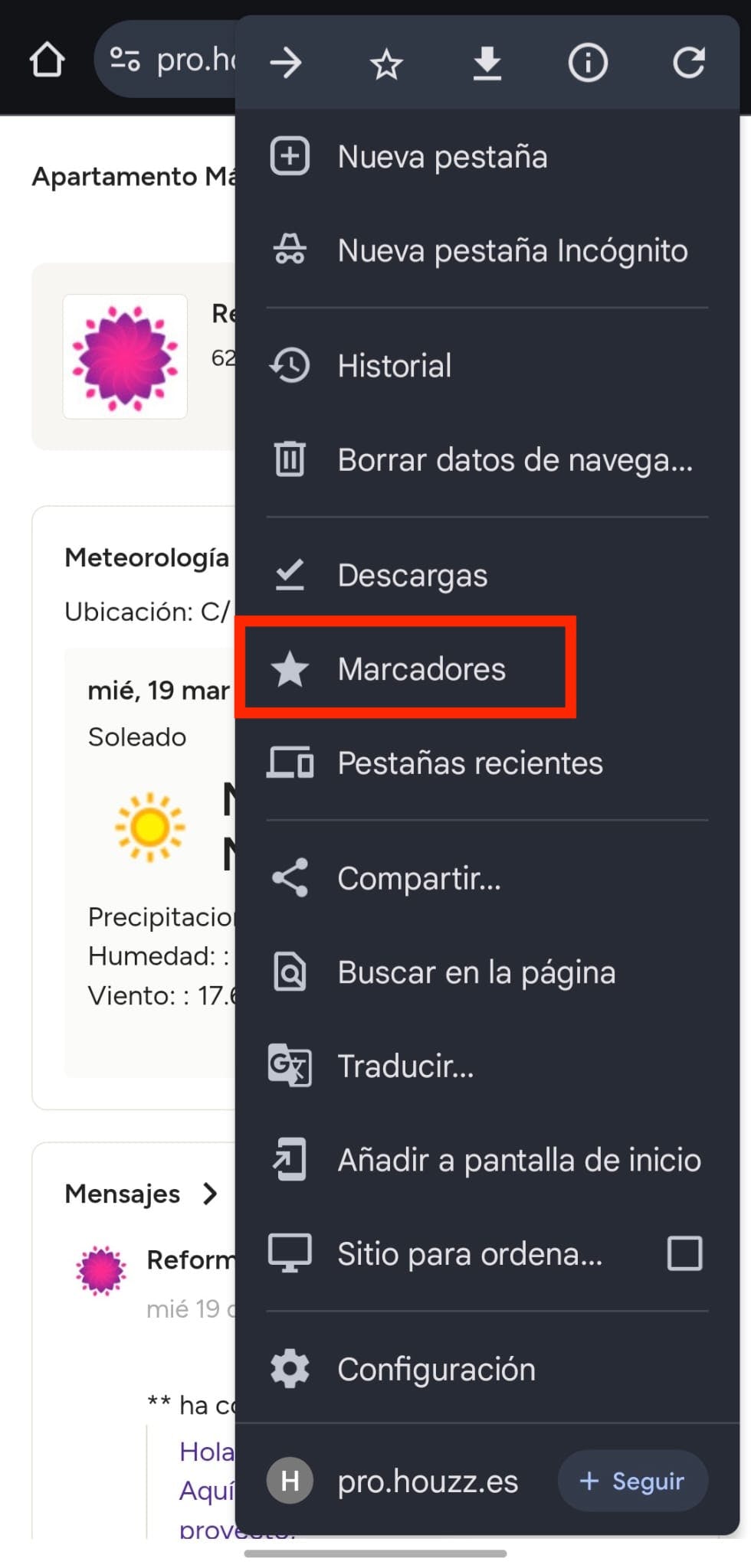El enlace al tablero de proyectos aparecerá ahora en tus marcadores. Para acceder a los mismos, toca el icono con forma de tres puntos a la derecha de la barra de navegación y selecciona la opción Marcadores en el menú.