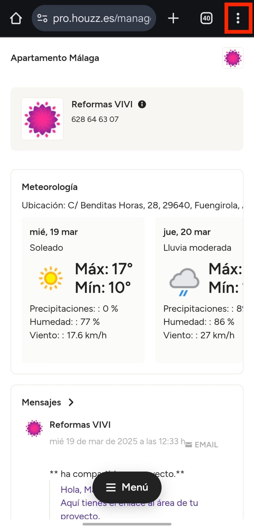 Para acceder rápidamente al tablero de proyectos en la app de Chrome en tu dispositivo móvil, abre el enlace y toca el icono con forma de tres puntos a la derecha de la barra de navegación.