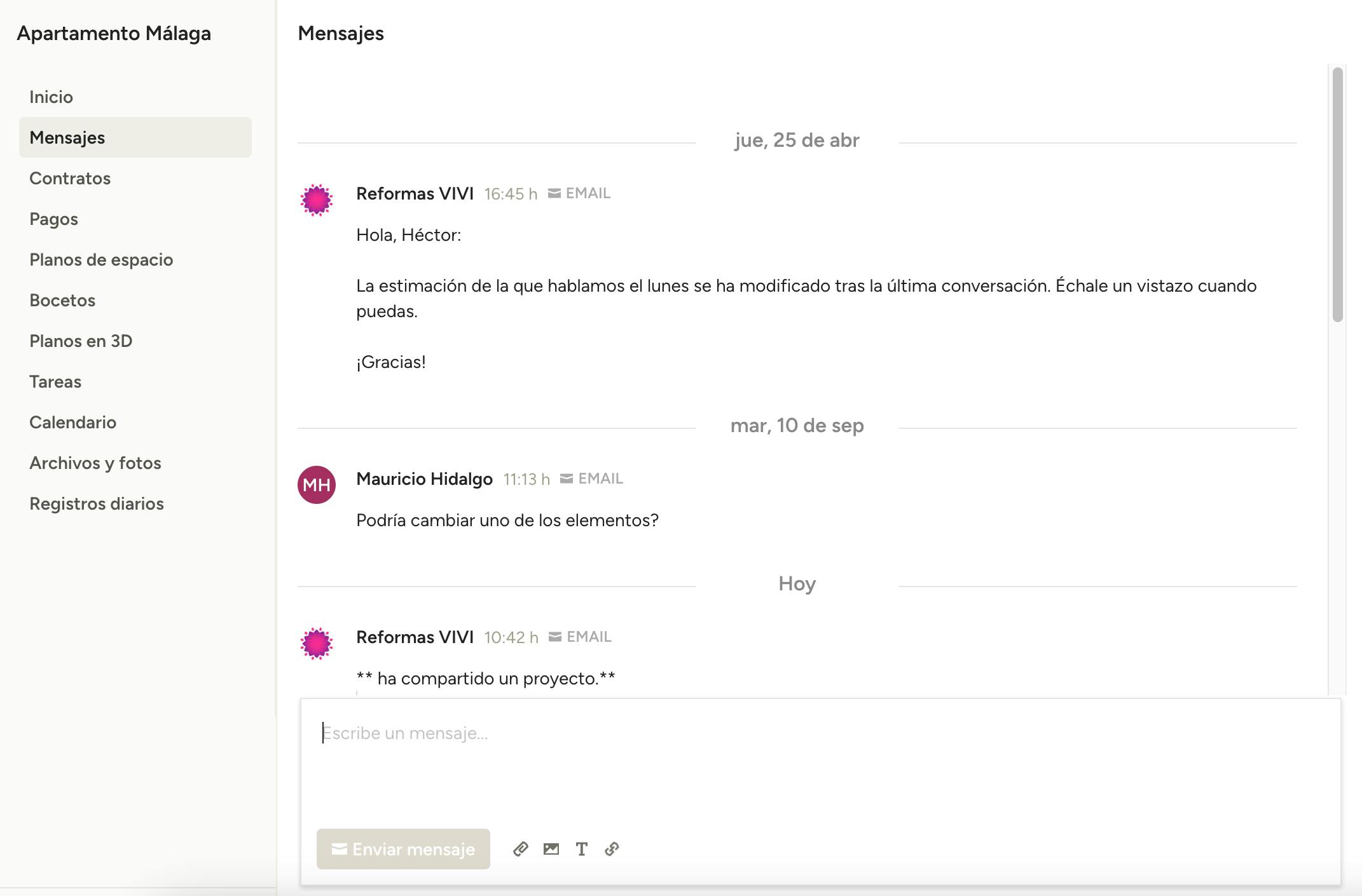 Todo el historial de comunicaciones con el profesional con el que estás trabajando puede consultarse en la sección Mensajes del tablero de proyectos. Puedes enviarle un mensaje usando el campo de texto que se encuentra al final de la página, con las opciones incluidas de adjuntar archivos o imágenes relevantes para tu proyecto.