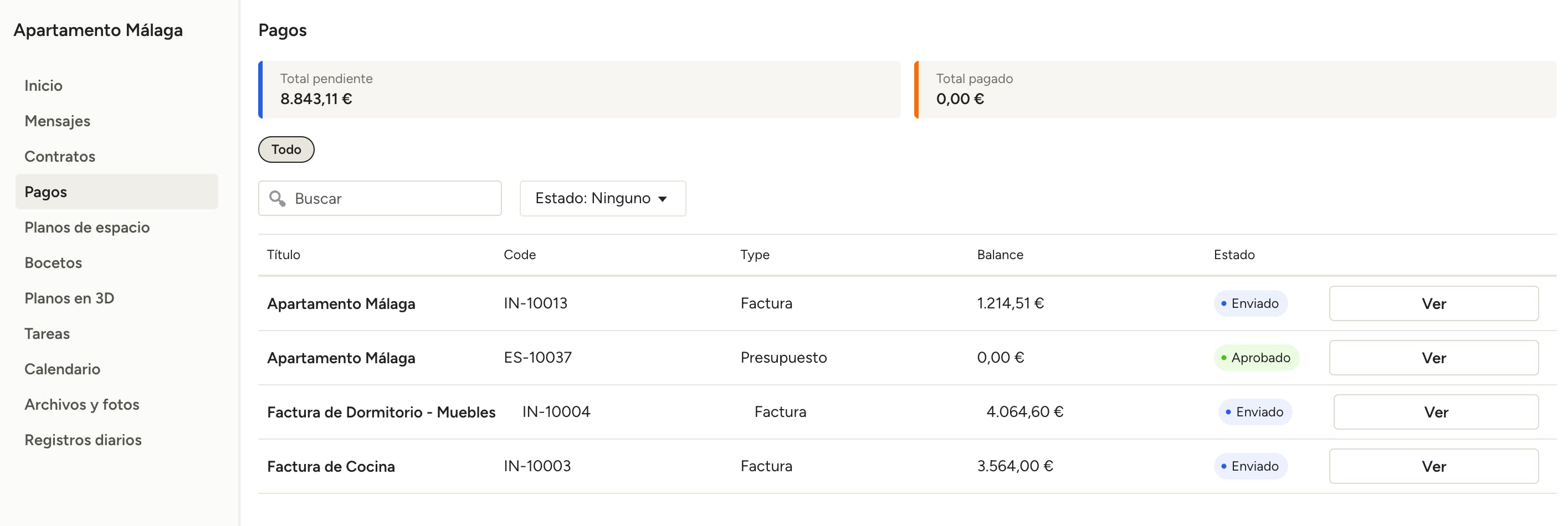 Dentro de la sección Pagos, podrás ver los documentos que te hayan enviado, incluidos los presupuestos, las facturas y las modificaciones de pago, además de un resumen general de los totales del proyecto (si el profesional ha configurado compartir esta información contigo).