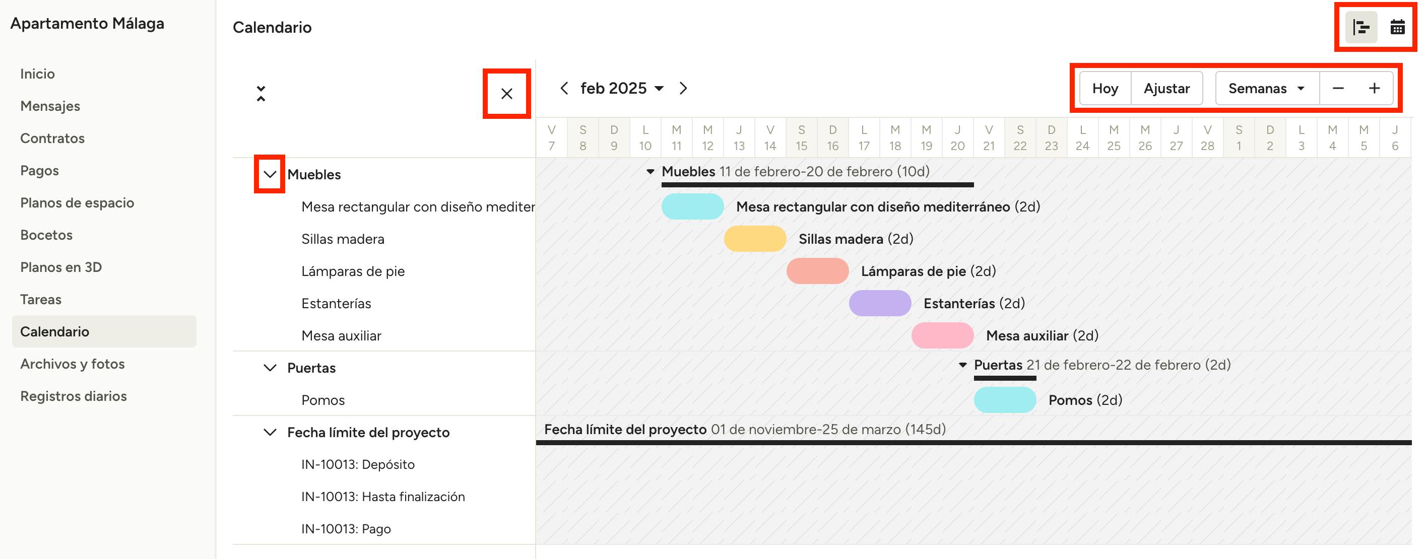 Si el profesional ha compartido el calendario del proyecto contigo, podrás ver un resumen general del mismo. Puedes modificar la vista del calendario a través de los iconos en la parte superior derecha.