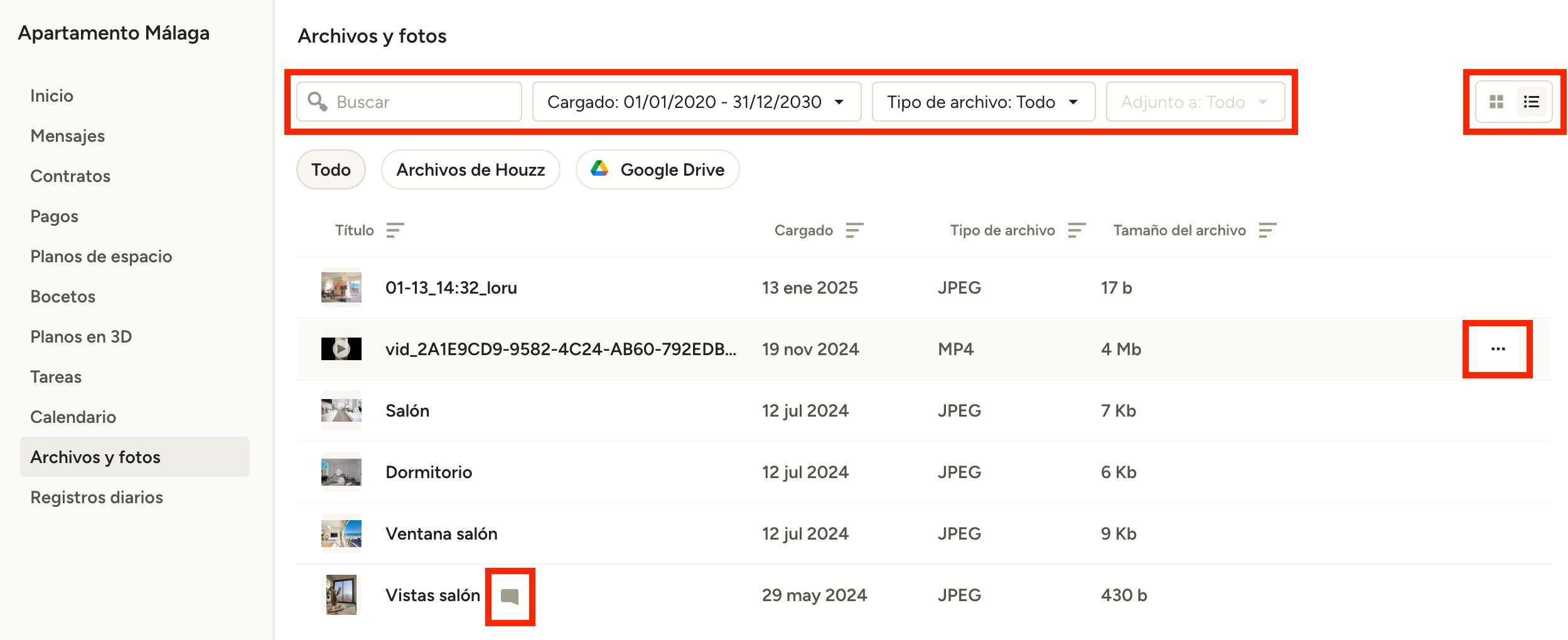 Todos los archivos, incluidas las fotos y los planos en 3D, aparecerán en la sección Archivos. Usa las opciones de buscar, filtrar y ordenar de la parte superior para encontrar un archivo rápidamente. Puedes intercambiar entre vista de cuadrícula y vista de lista en la parte superior derecha de la pantalla.