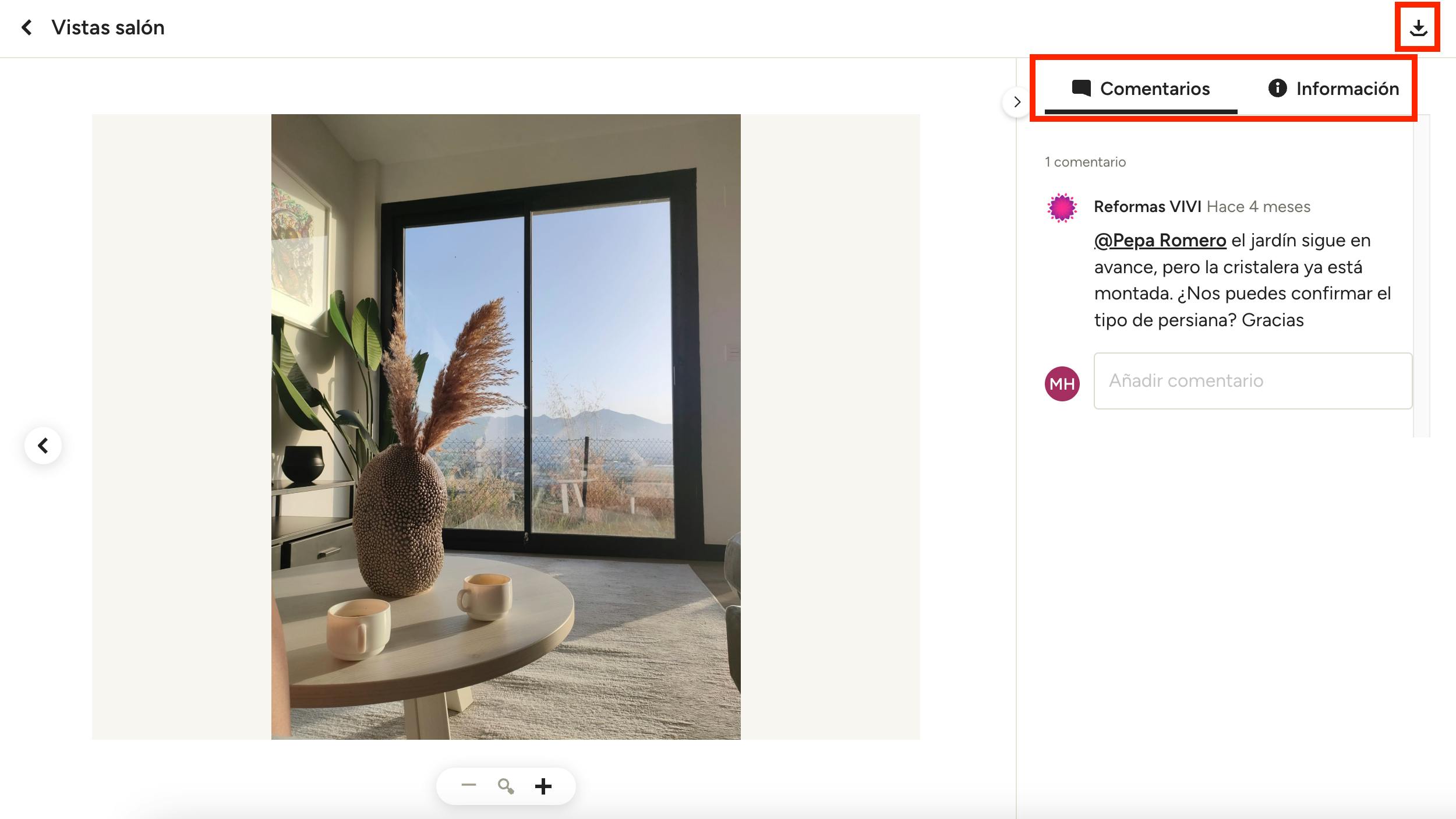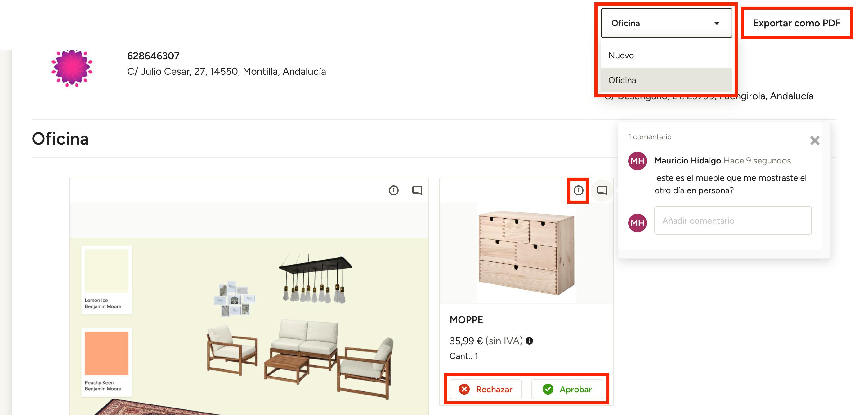 Dentro de un plano de espacio, en función de la información que el profesional haya compartido, podrás aprobar o rechazar elementos, verlos (haz clic en la imagen o en el icono con forma de i), ver y añadir comentarios, y exportar el plano de espacio en formato PDF (en la parte superior derecha).