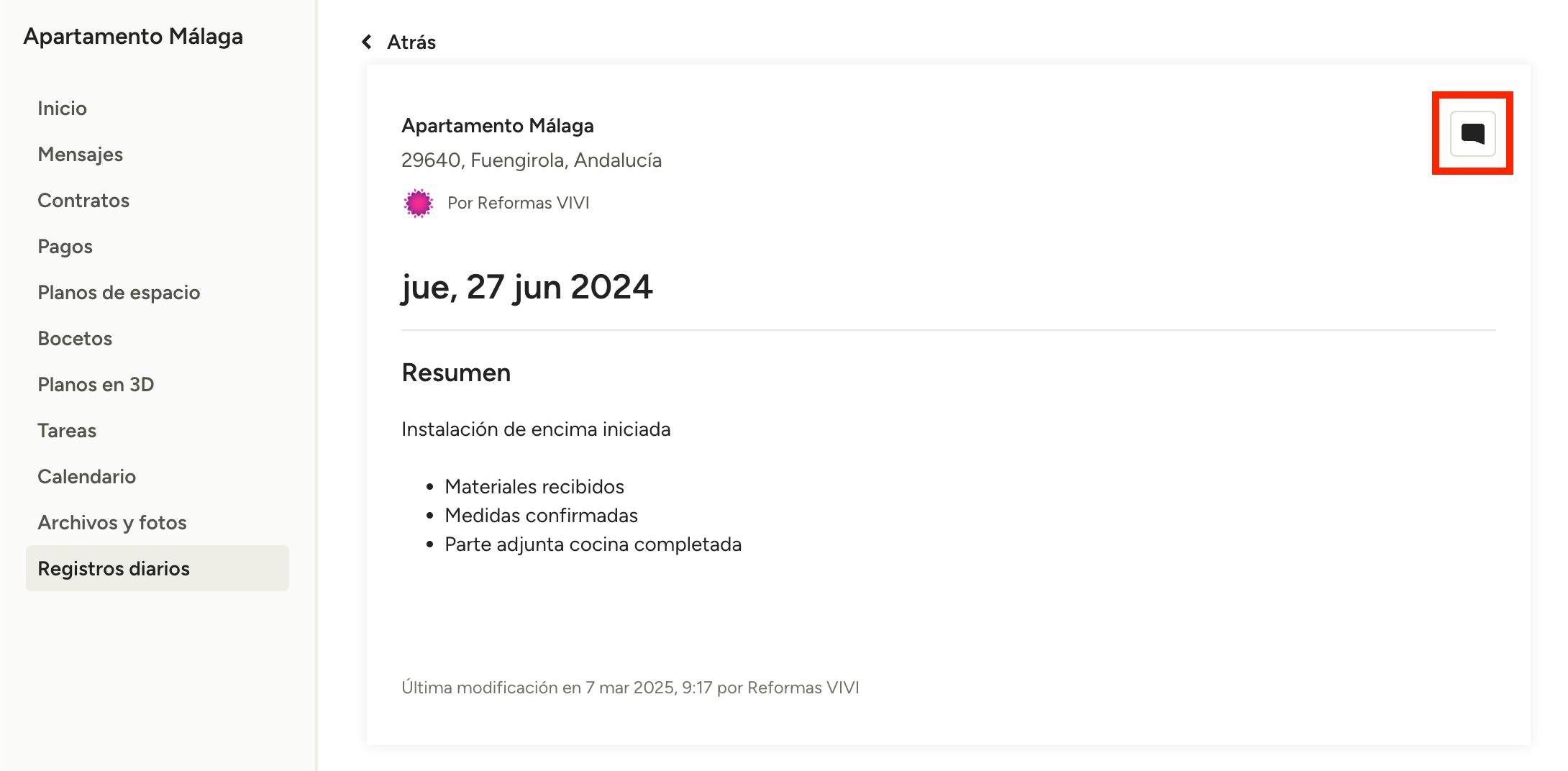 Para ver o añadir un comentario a un registro diario, haz clic en el icono de comentario en la parte superior derecha.