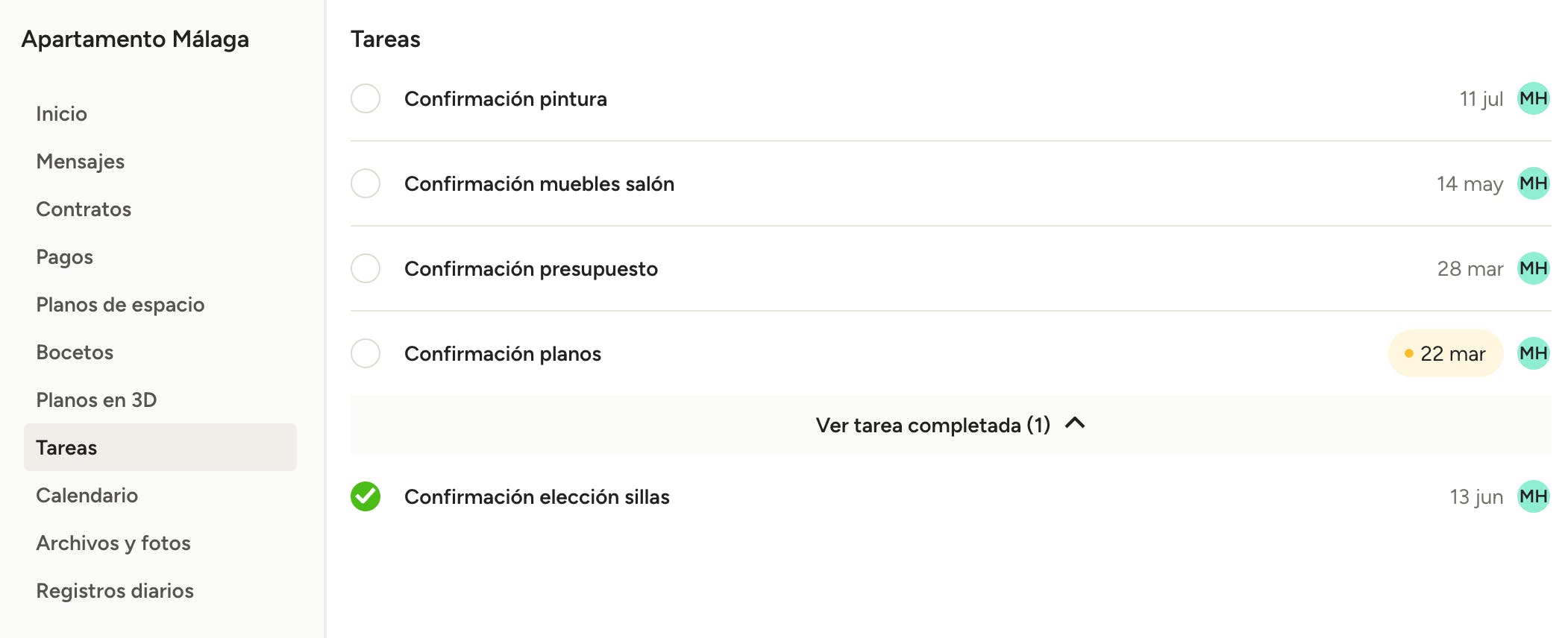 Si el profesional te ha asignado tareas, podrás verlas en el tablero de proyectos. Podrás ver los detalles de las tareas y sus fechas límite, y también marcarlas como completadas. Las tareas completadas se mostrarán al final de la lista.