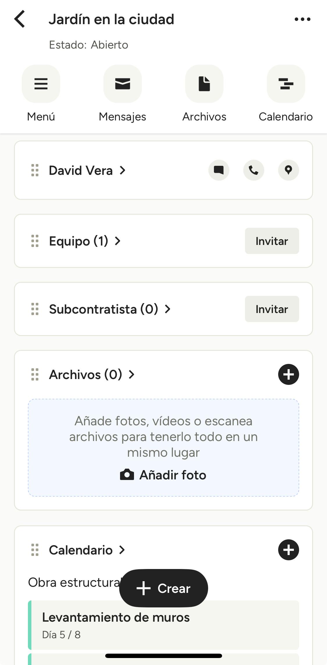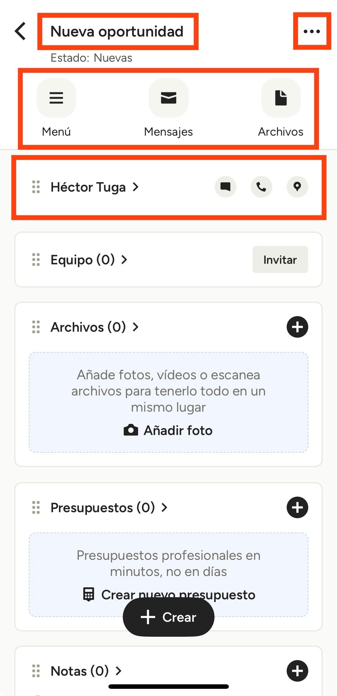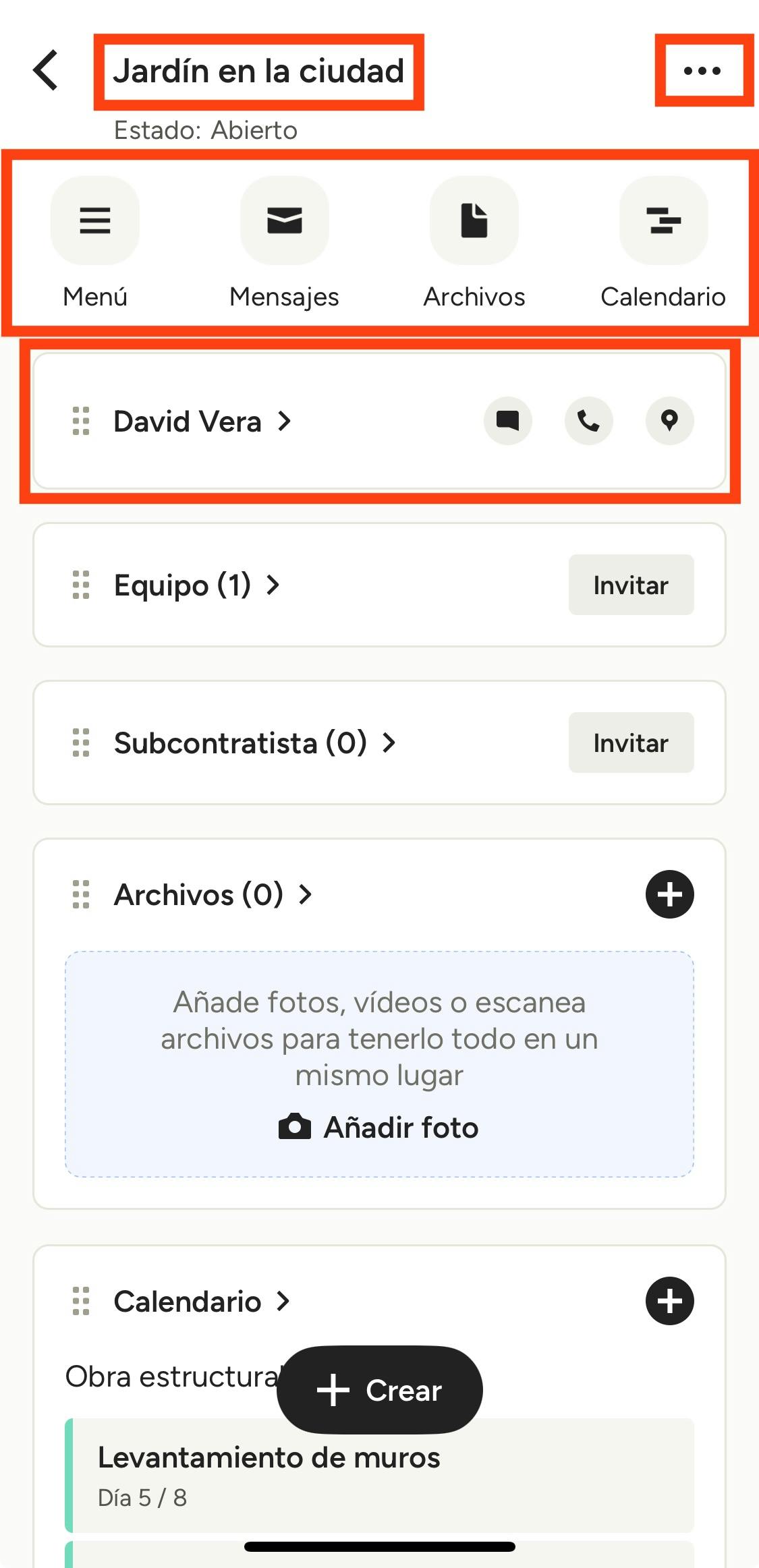 - El icono Menú para crear contenido para el proyecto, como presupuestos o notas.