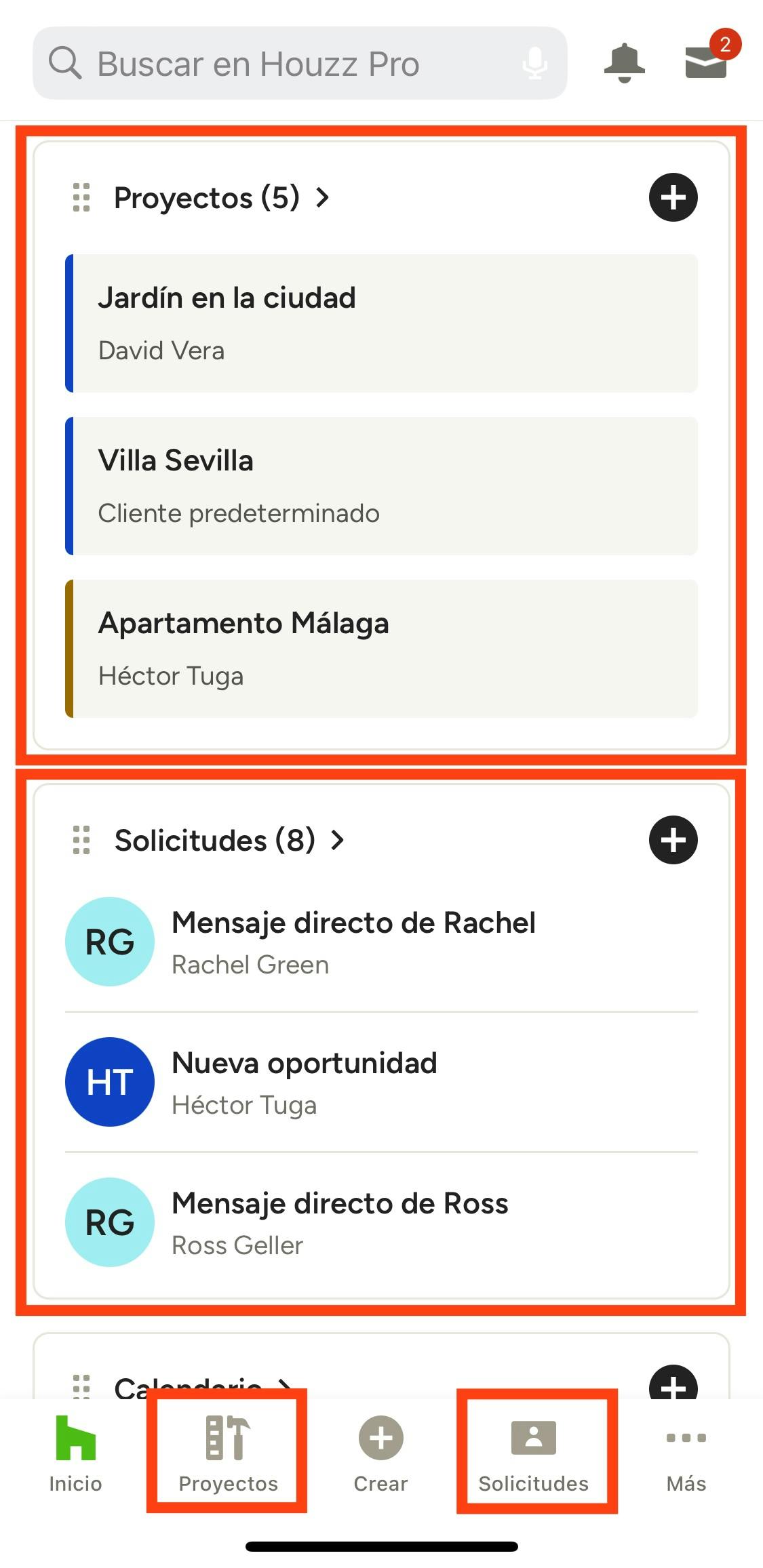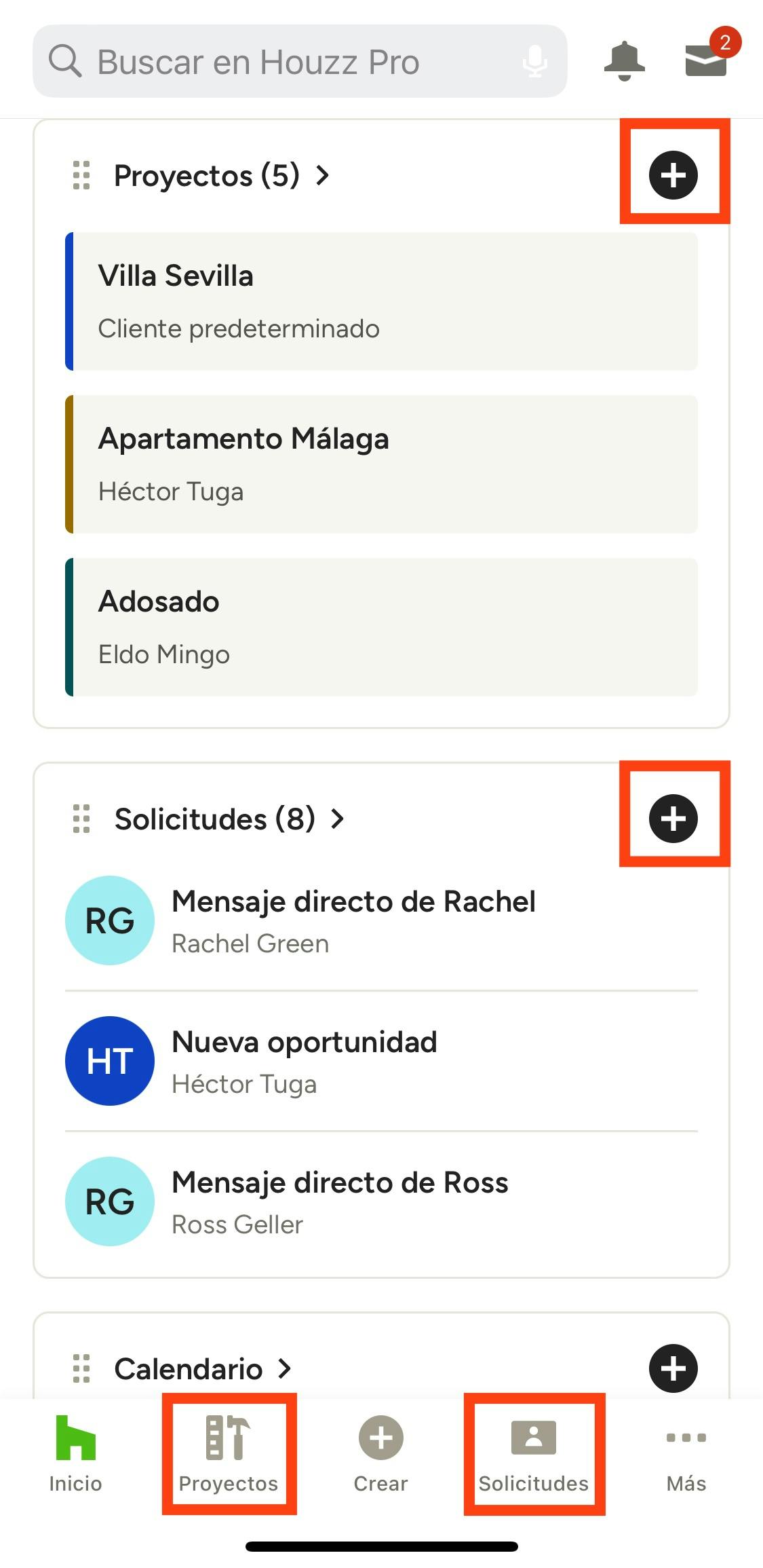- Desplazarte hacia abajo hasta llegar a la sección Proyectos o Solicitudes desde la pantalla principal y después tocar el icono con forma de + junto al título de la sección.