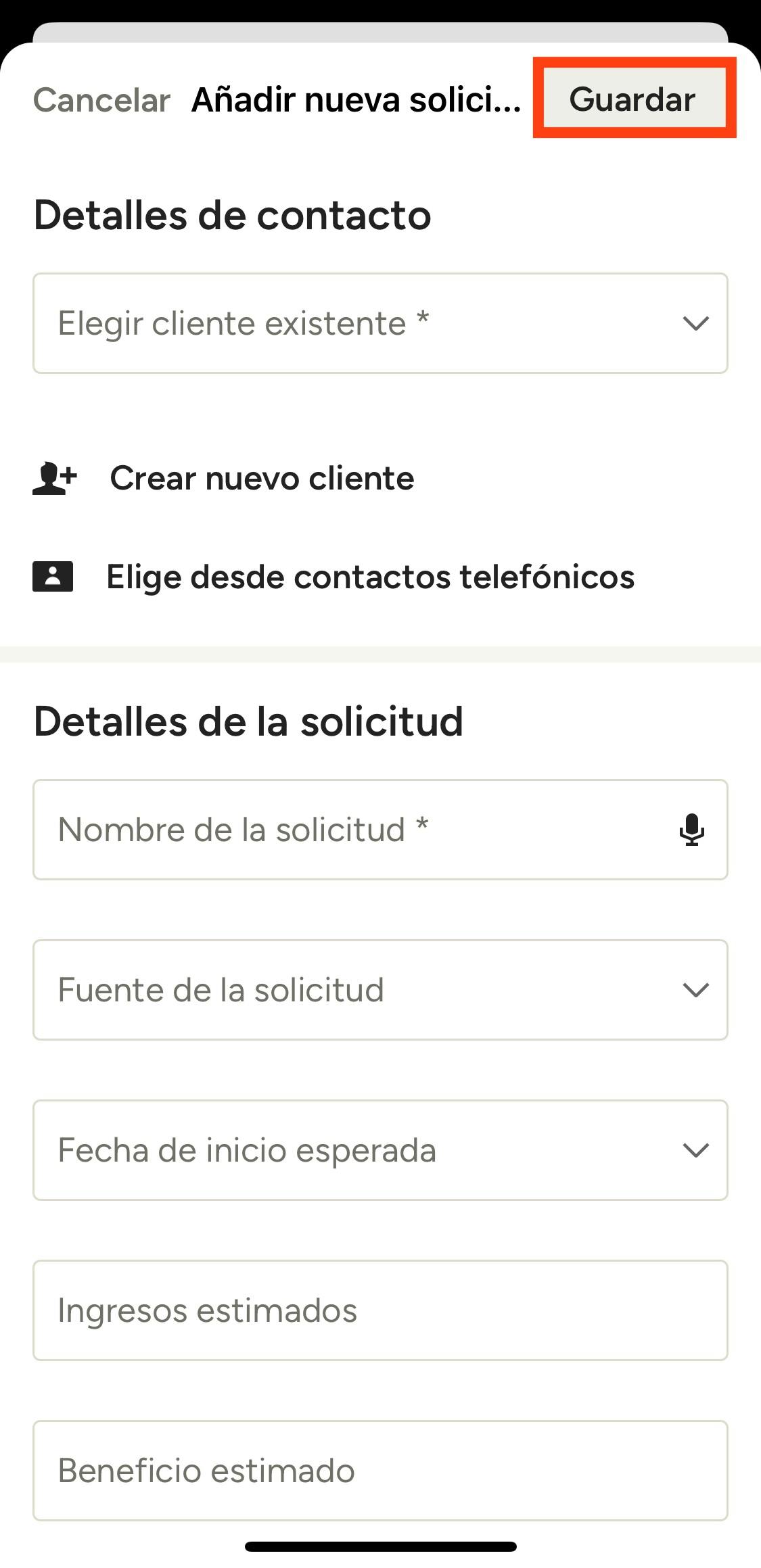 Para los detalles de contacto puedes elegir entre aquellos de clientes existentes, crear un cliente nuevo o elegir uno de tu teléfono. Para los detalles de la solicitud puedes introducir toda la información relevante sobre el proyecto, tal como el nombre de la solicitud, la fuente, la fecha de inicio, el tipo de proyecto, y los ingresos, beneficios y presupuestos estimados.