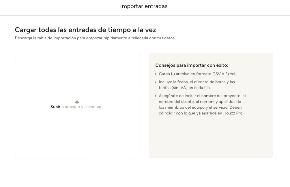 Desde la sección Tiempo y Gastos, puedes importar entradas de tiempo desde otros servicios de software, como Harvest. Para que la importación tenga éxito, deberás asegurarte de que sólo cargas archivos Excel o CSV, y de que se rellenan los campos obligatorios.