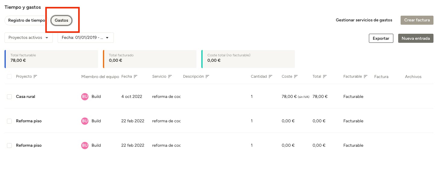Puedes filtrar el tiempo y los gastos por proyecto, por miembro del equipo responsable, por la fecha asociada a estas entradas o por el tipo de servicio ofrecido: solo tienes que usar el menú desplegable que se encuentra en la parte superior. Verás un resumen de la duración total del tiempo, el importe total facturable y el coste total (no facturable), y los resultados se ajustarán en función de los filtros que apliques.