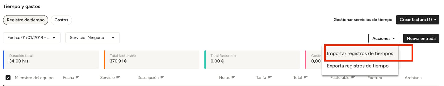 Selecciona Importar entradas de tiempo en el desplegable Acciones para empezar.