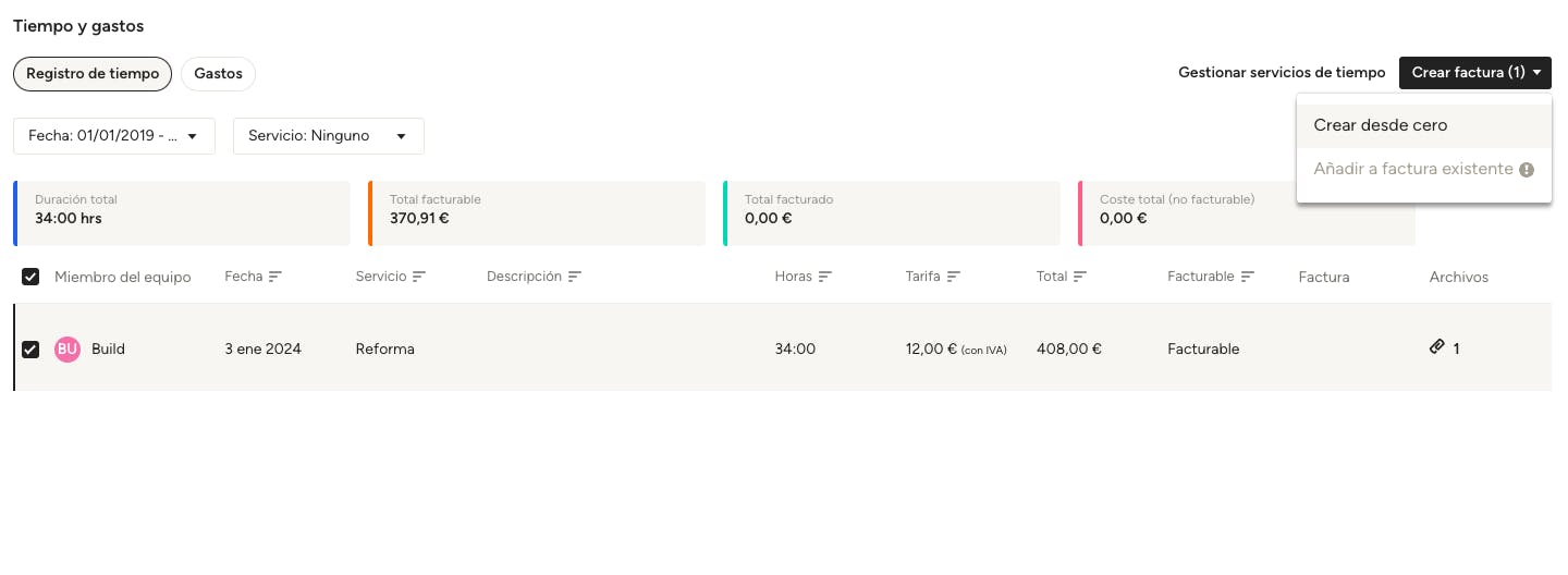 Selecciona "Crear desde cero" para crear una nueva factura. Si el proyecto tiene facturas abiertas, "Añadir a factura existente" también será una opción.