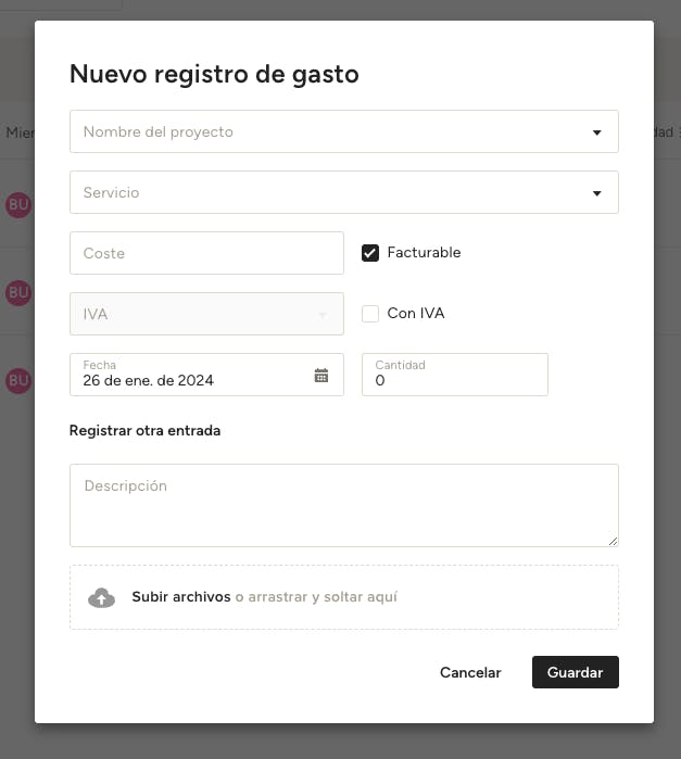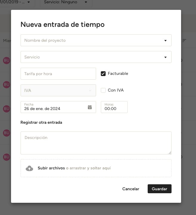 En el modal que aparece, introduce los detalles pertinentes, incluyendo el nombre del proyecto, el miembro del equipo, el servicio, la fecha, la tarifa por hora, las horas y cualquier descripción o archivos necesarios.