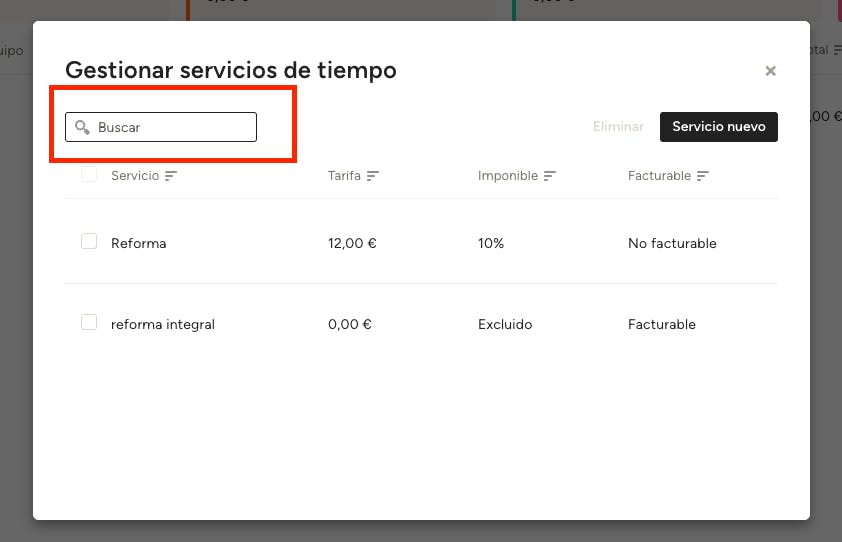 En la pantalla Gestionar Servicios, también tienes la posibilidad de filtrar por miembro del equipo y buscar utilizando palabras clave. Además, puedes ordenar los servicios de la A a la Z o por Tarifa Horaria haciendo clic en los nombres de las columnas para cambiar el orden.