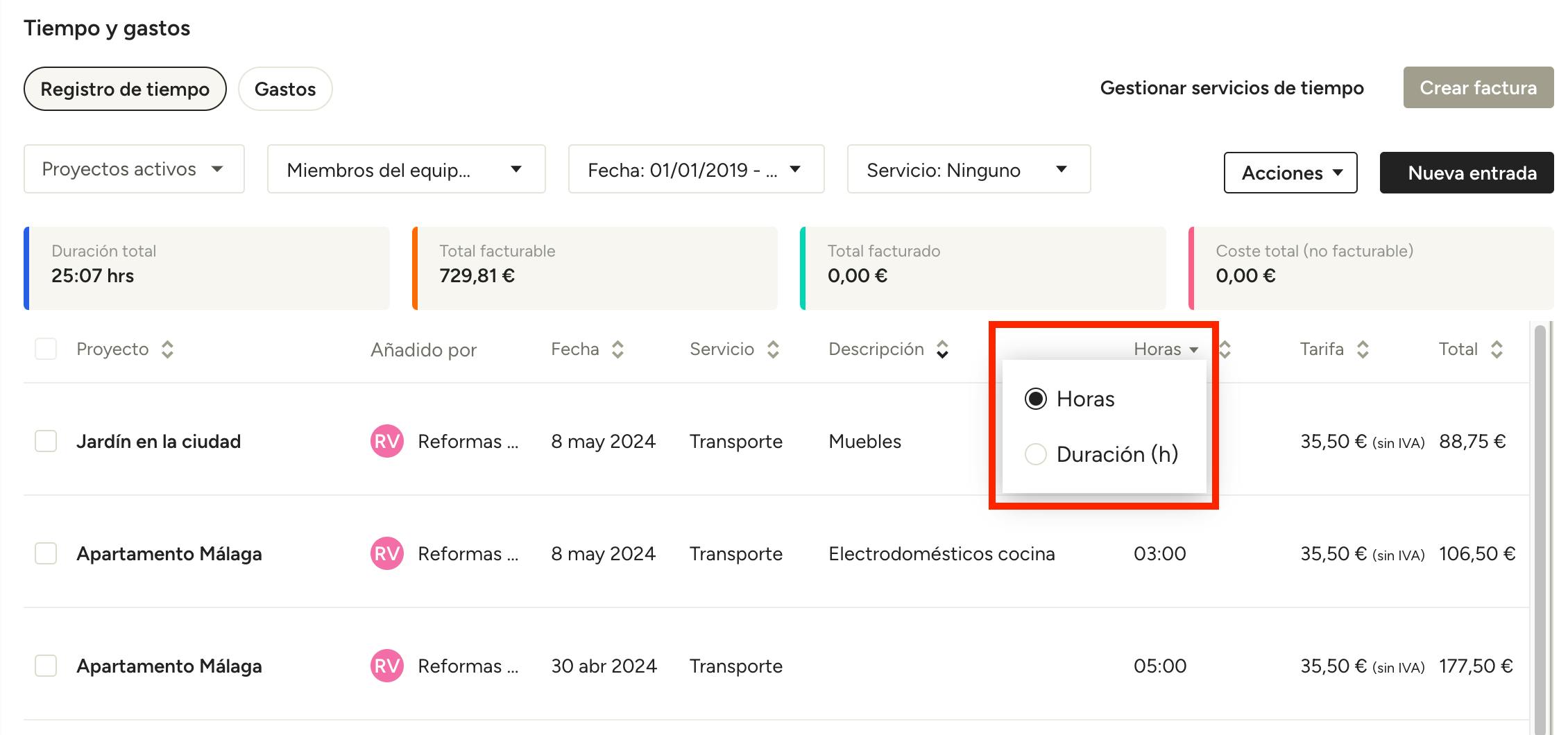 Para ajustar el formato en el que se muestra el tiempo, haz clic en el título de la columna de tiempo (verás las opciones de Horas y Duración (h) en función de lo que hayas seleccionado). Elige si quieres mostrar el tiempo en horas (por ejemplo, 02:30) en en duración con decimales (por ejemplo, 2,5). El formato de duración puede ser muy útil a la hora de exportar entradas de tiempo para usarlas en nóminas.