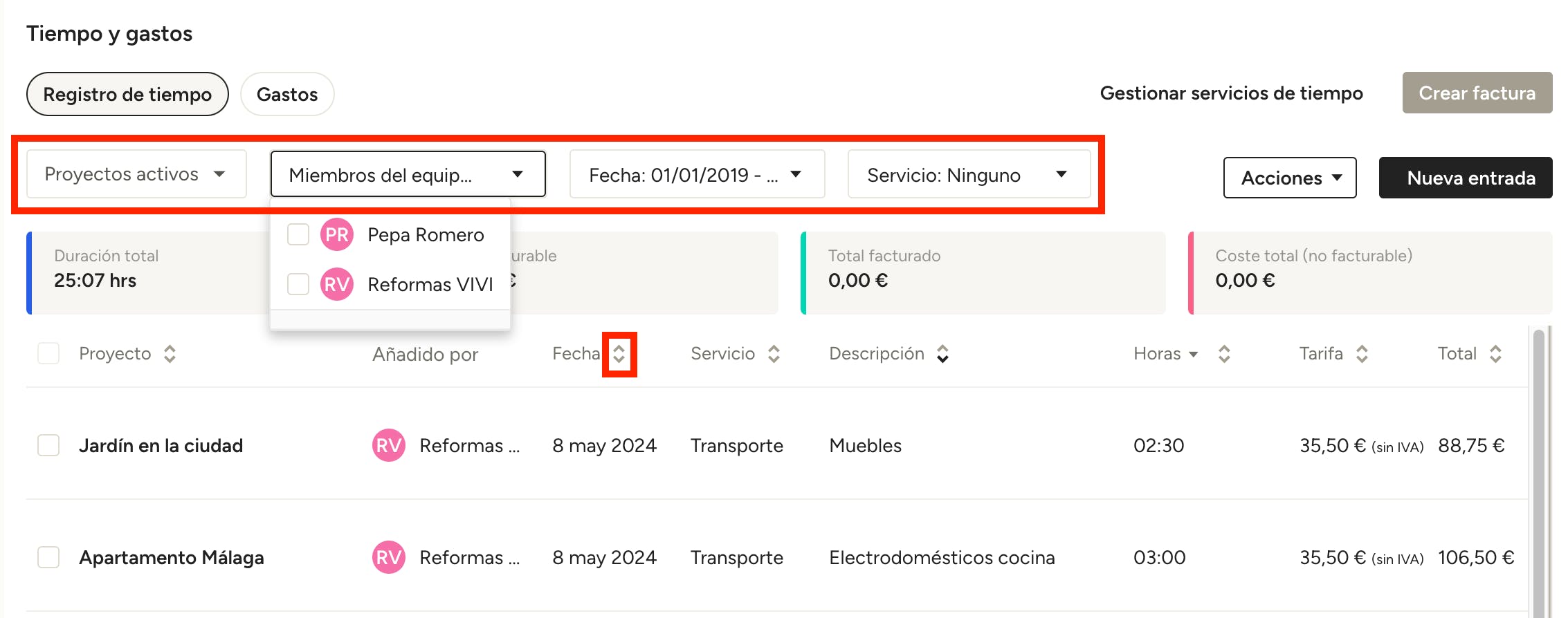 Para cambiar el orden en el que se ordenan las entradas, usa las flechas en la columna que elijas para cambiarlo (Proyecto, Fecha, Servicio, etc.).