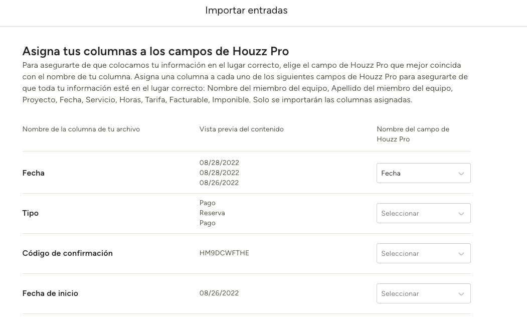 A continuación, confirma que tus columnas están asignadas al campo correcto de Houzz Pro. Sólo se importarán las columnas asignadas. Haz clic en Listo y ¡listo!
