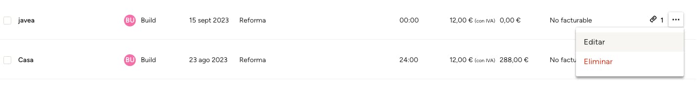Puedes editar o eliminar una entrada haciendo clic en los tres puntos situados a la derecha de la entrada y seleccionando la acción que deseas realizar.