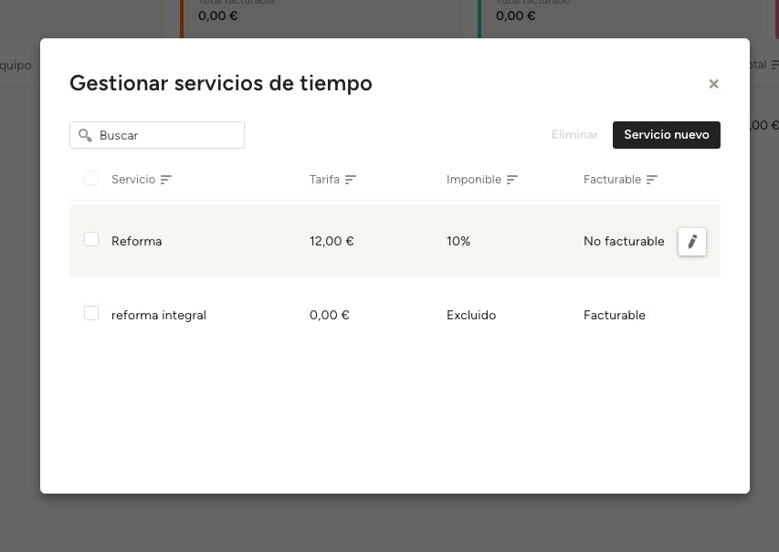 Puedes ver todas las tarifas de tiempo y gastos de los distintos miembros del equipo en una sola vista, donde puedes ordenarlas, editarlas, crearlas y eliminarlas. Estos servicios se guardan para utilizarlos en tus futuros proyectos.