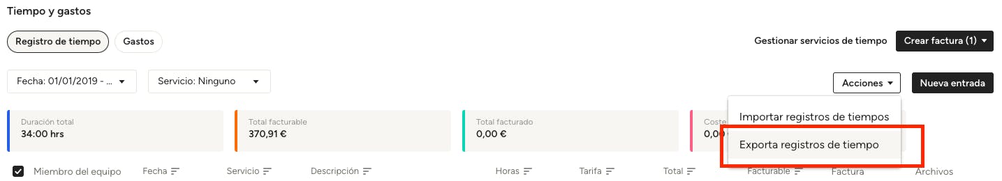 Puede exportar las entradas de tiempo o de gastos a Excel con fines de contabilidad: es una forma excelente de descargar el tiempo por proyecto o por miembro del equipo para usarlos en las nóminas. Para ello, selecciona Exportar entradas de tiempo en el menú desplegable Acciones (en la pestaña Tiempo). En la pestaña Gastos, haz clic en el botón Exportar que se encuentra en la parte superior derecha.