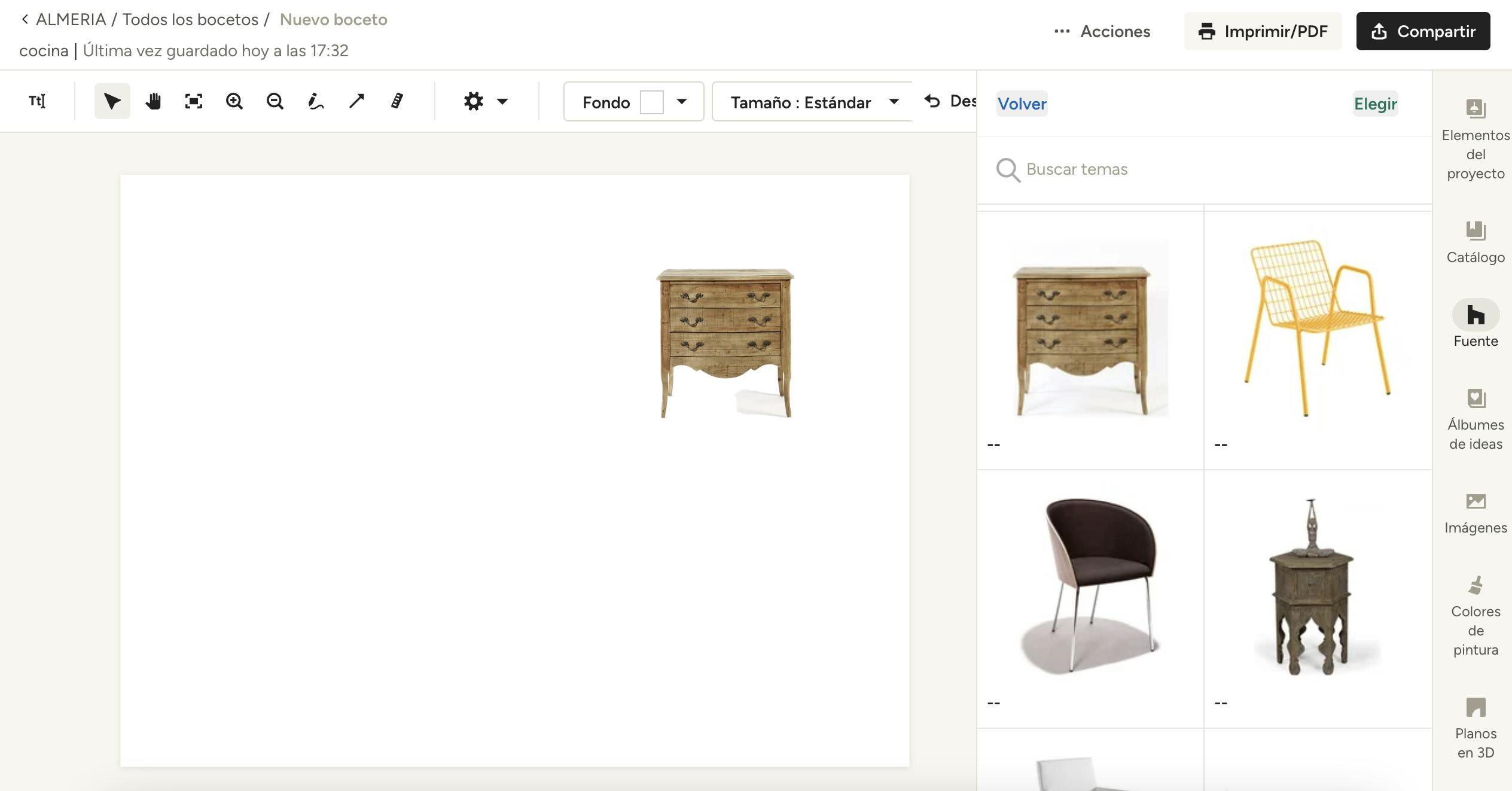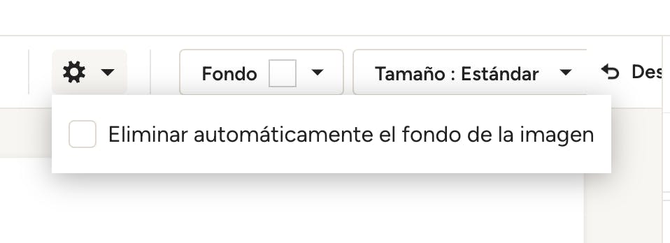 Puedes decidir si quieres aprovechar nuestra tecnología inteligente para eliminar automáticamente el fondo de cualquier imagen añadida por defecto a tus Mood Boards. En la barra de herramientas superior, haz clic en el icono de Configuración para que aparezca la opción "Eliminar automáticamente la imagen de fondo". Si la casilla está marcada, el eliminador de fondo se aplica por defecto sin problemas a cualquier imagen que añadas a tu Bocetos, sin requerir ninguna acción adicional por tu parte. Para desactivar la eliminación automática del fondo, simplemente desmarca la casilla. Siempre tienes la opción de eliminar el fondo de cualquier imagen en cualquier momento mediante el proceso que se detalla a continuación.